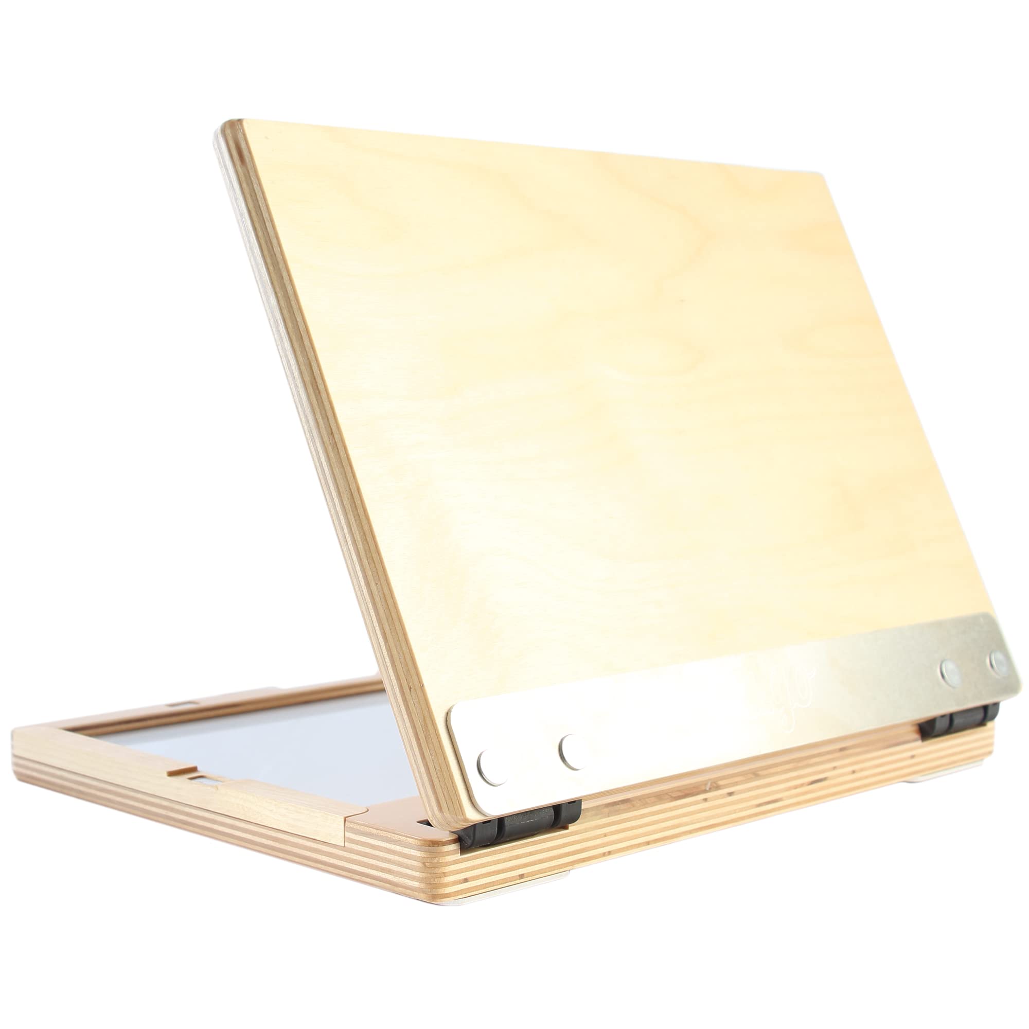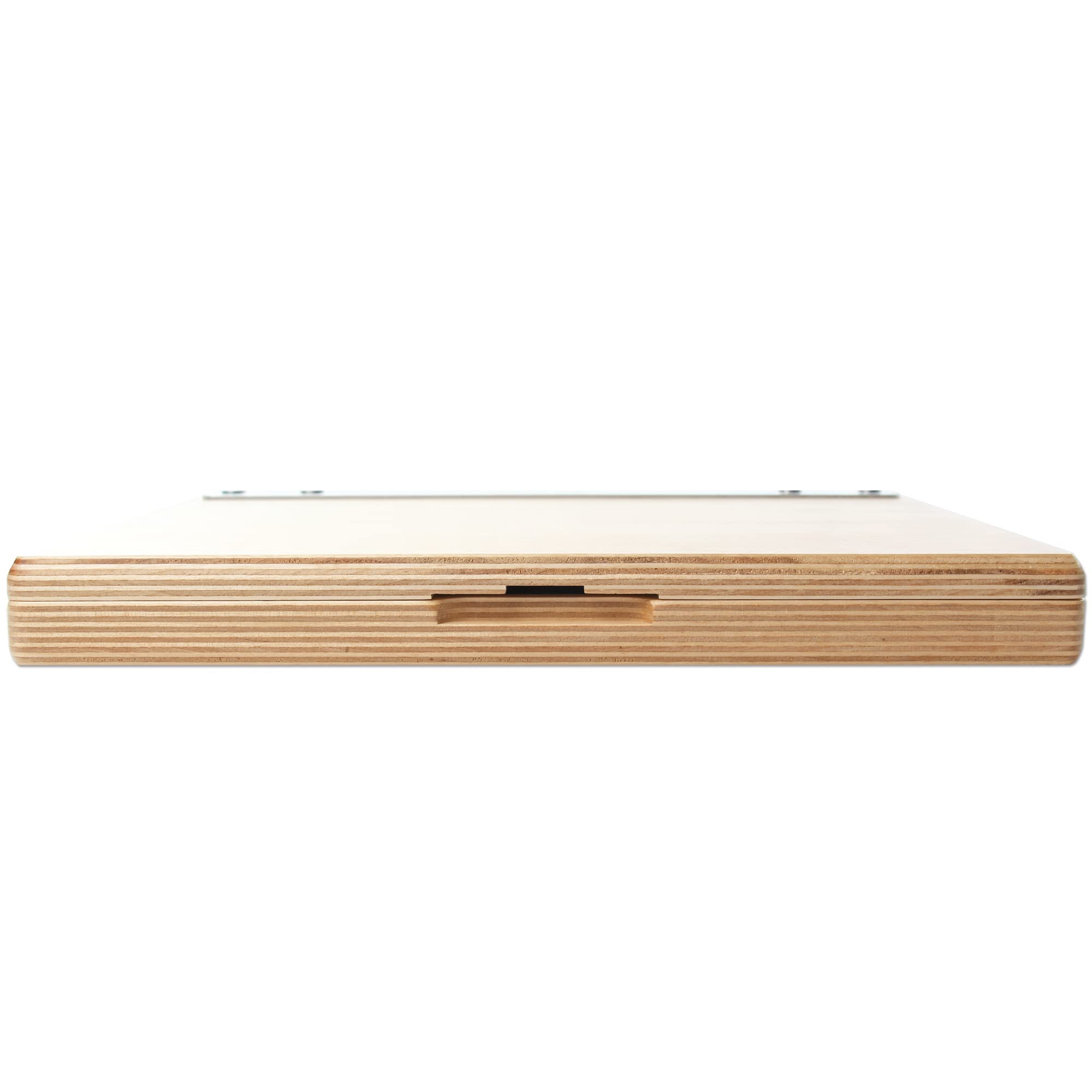 Materials: The u.go Anywhere Pochade Box is made using Baltic Birch wood, while stainless steel and aluminum accents provide strength where needed most. All hardware is non-corrosive. The Baltic Birch is hand sanded and finished with New Wave proprietary wood finish for maximum durability. The finish on the pochade box easel is non-porous, dense, and resistant to water as well as standard artist solvents and mediums. In addition, the finish is crack resistant, chip resistant, and non-yellowing.