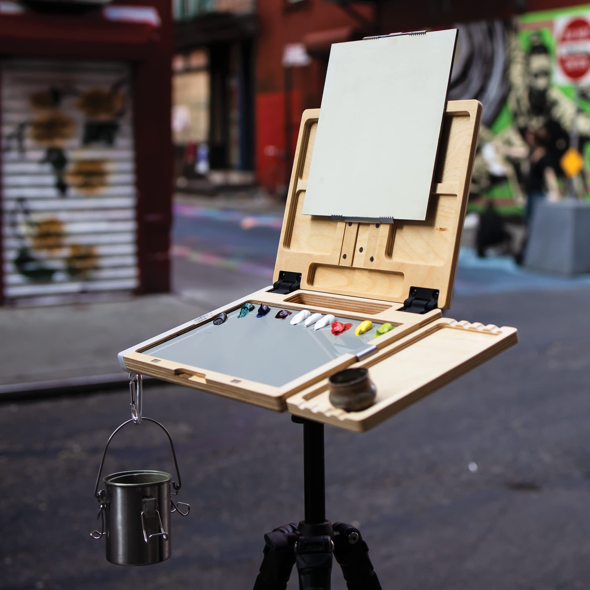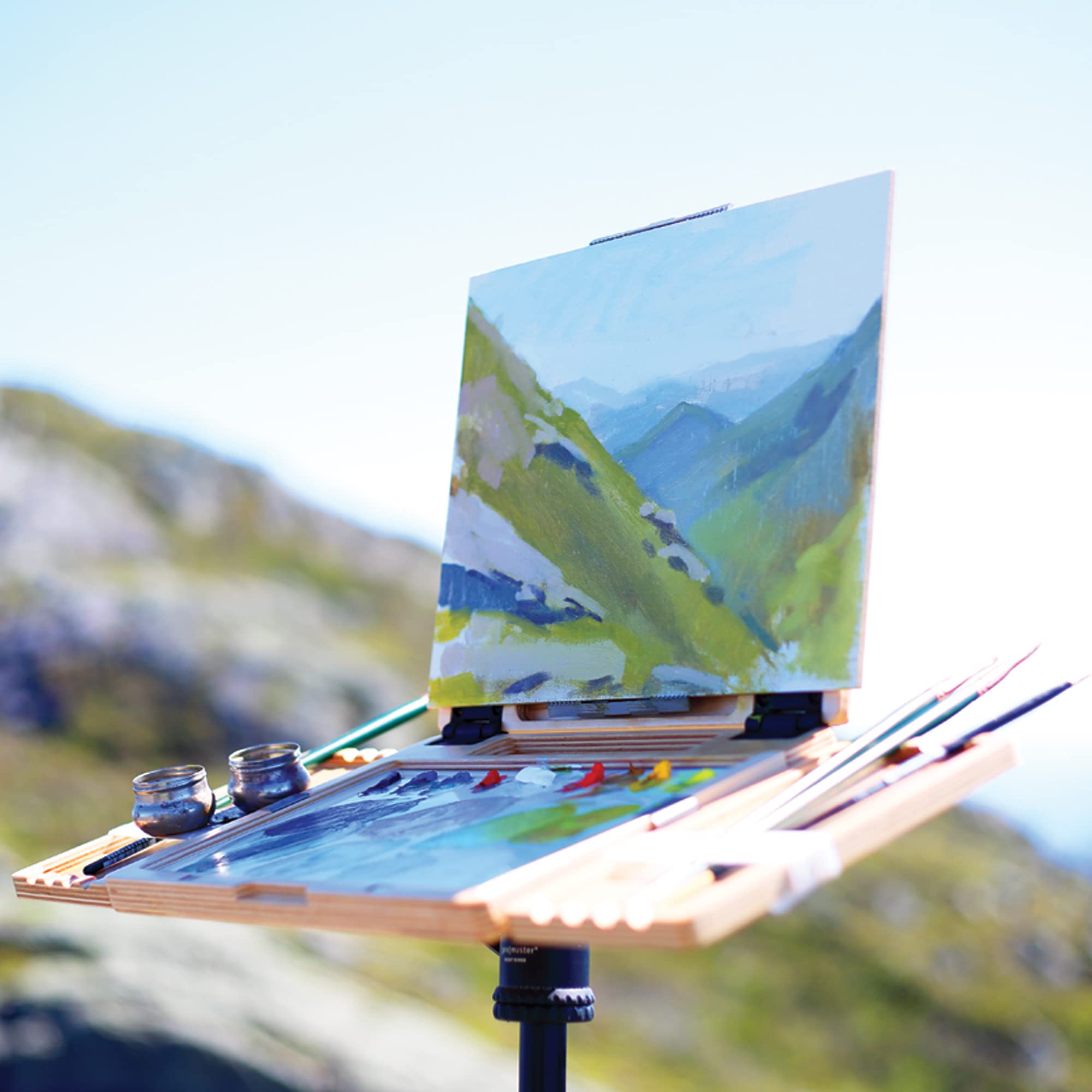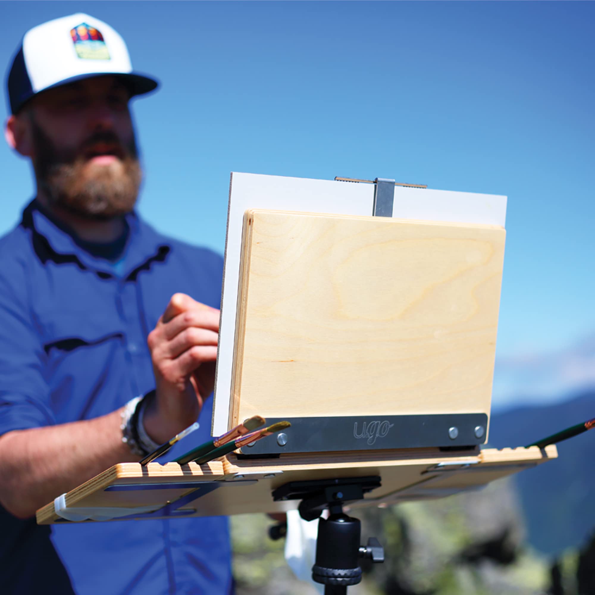 The u.go Anywhere Pochade Box was designed for travel from sea to summit and anywhere in between. The plein air painting pochade box is designed and manufactured by New Wave in Pennsylvania, USA. Each tree's inherent beauty, shown in the grain lines, knots, and varying wood tones, combines with the work handcrafting each plein air pochade box to create an item that is uniquely yours. u.go Pochade Boxes are a modern take on the French Easel with a streamlined design that comes fully assembled and ready for immediate use. Made using Baltic Birch wood with stainless steel and aluminum accents providing strength where needed most. All hardware is non-corrosive. The Baltic Birch is hand sanded and finished with New Wave proprietary wood finish for maximum durability. The finish on the pochade box easel is non-porous, dense, and resistant to water as well as standard artist solvents and mediums. Strong rare earth magnets are used for the closure, panel/canvas holder, removable side wall for palette cleaning/replacement, and accessory side tray attachment. Friction hinges with a sturdy 180° range of motion allow you to position the pochade box as vertical or horizontal. Horizontal set up can be used as a watercolor easel tabletop. Anywhere Pochade Boxes are compatible with universal 1/4" tripod mounts, making it perfect for use as a tripod painting easel. The plein air easels have a smooth exterior free of protruding wood or metal components allowing for quick and easy storage in any pack. Each u.go Pochade Box comes with a high density plastic painting palette included. Oil paints can be removed with solvents, and dry acrylic paint peels off. Paint dabs can be stored on the palette when the lid is closed due to a recessed palette and recessed lid on the art easel box. While lightweight for use as a travel easel and plein air easel, the u.go Anywhere Pochade Boxes are sturdy easels for painting.