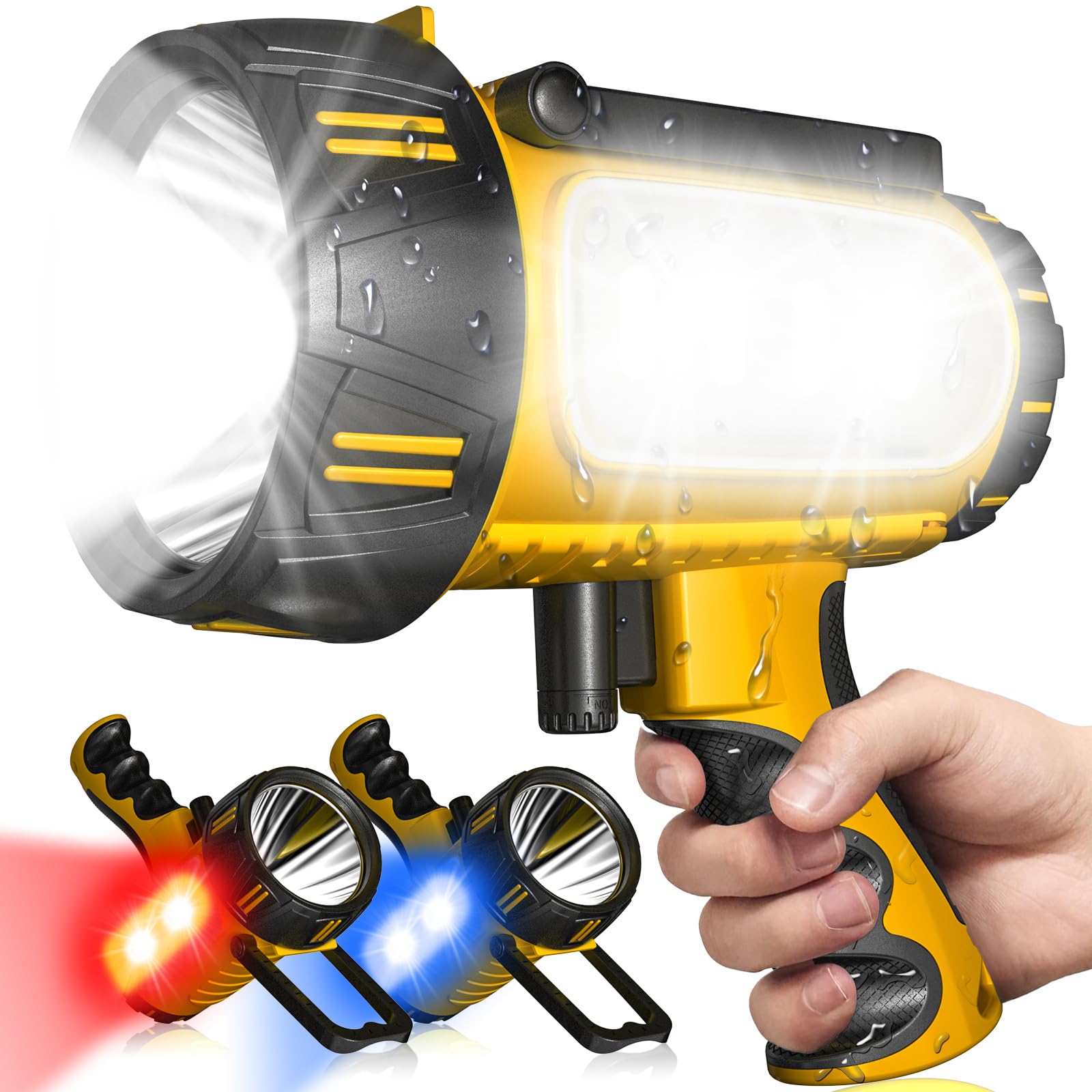 【10000mAh Large Capacity & Power Bank Function】: Rechargeable handheld spotlight flashlight can recharge 2000 times+. Runtime is over 48+ hours.Our emergency spotlight can also serve as a power bank for smartphones or mobile devices in an emergency, bringing you much convenience to your outdoor travel.Smart multiple protection (overcharge/ over discharge protection) can keep it safe and steady when you use it to charge your smart devices.