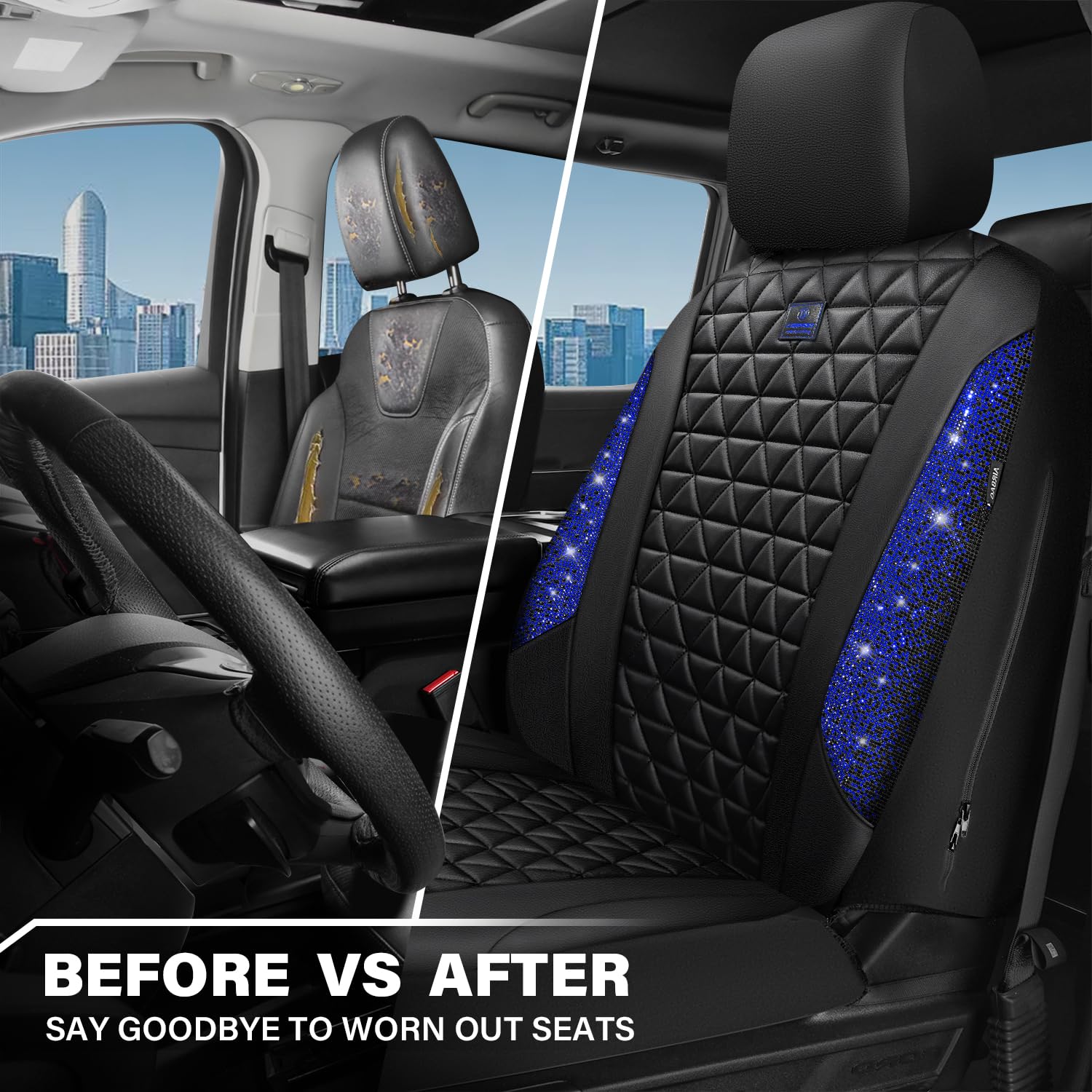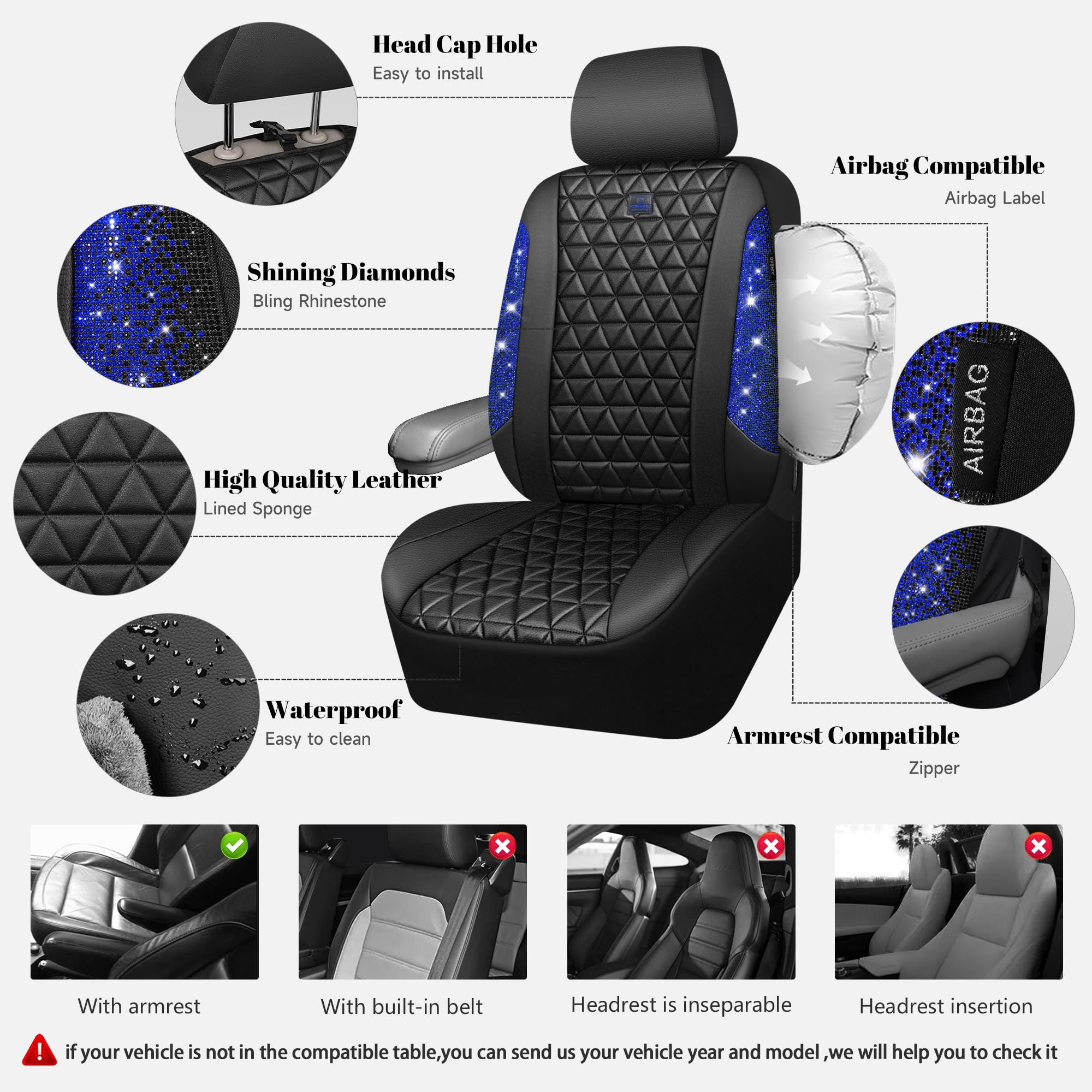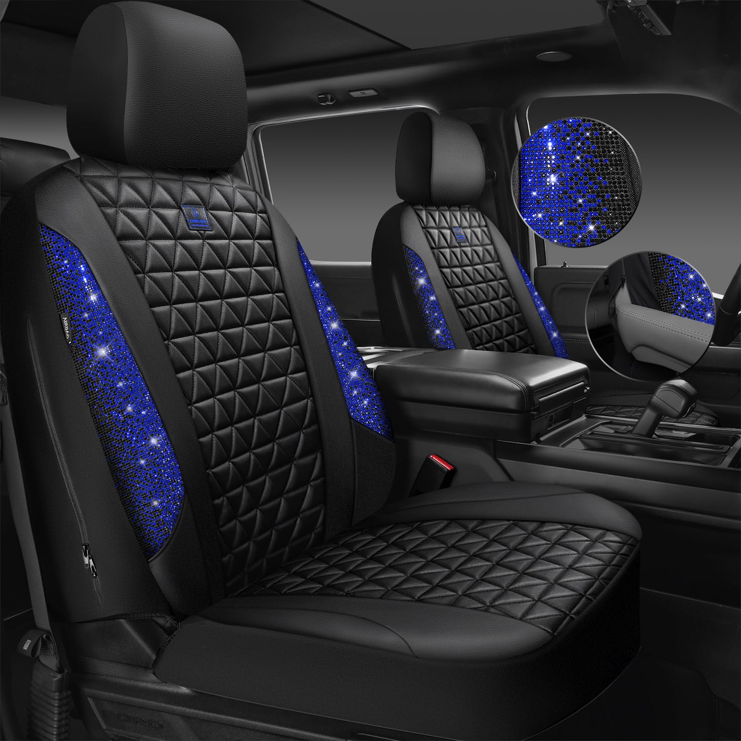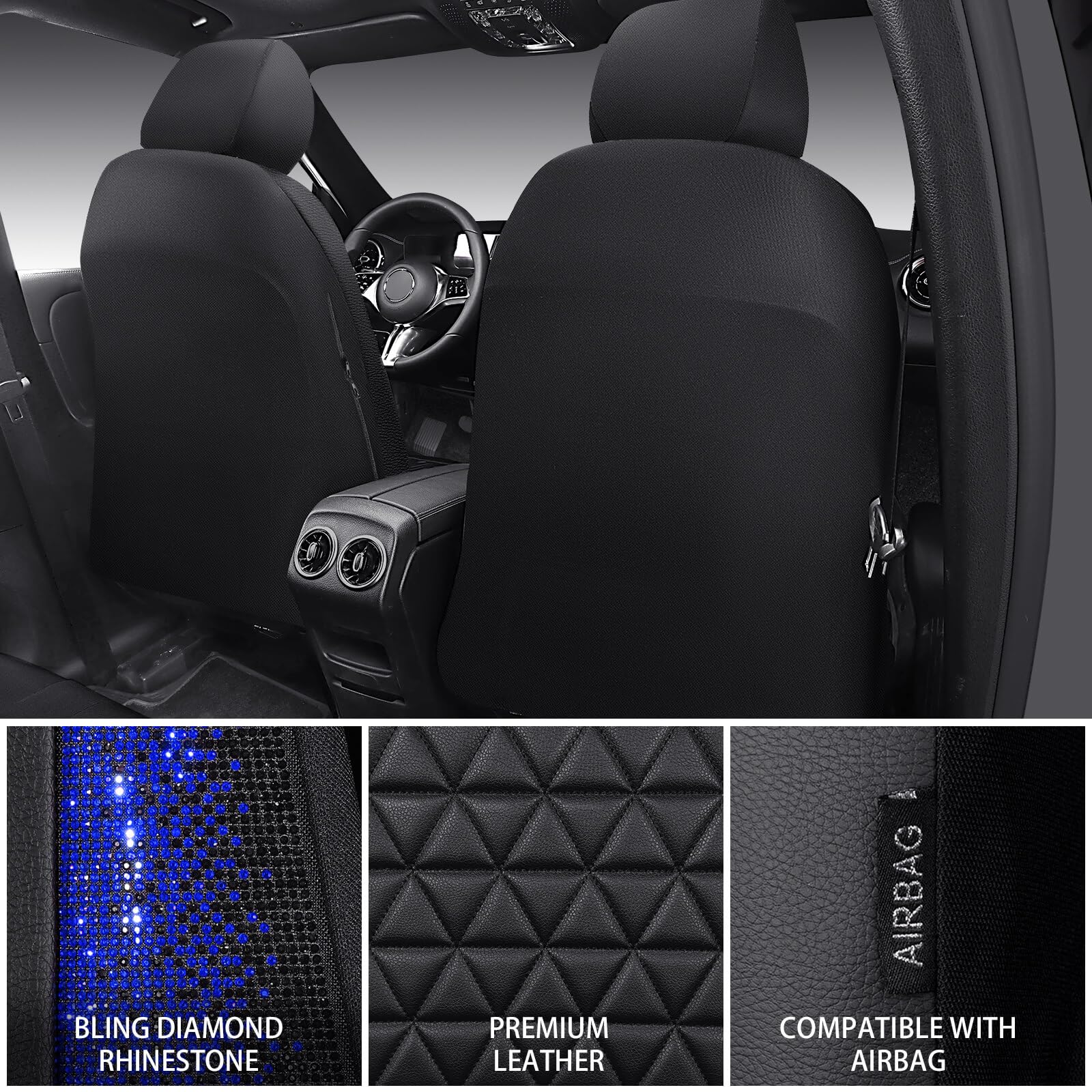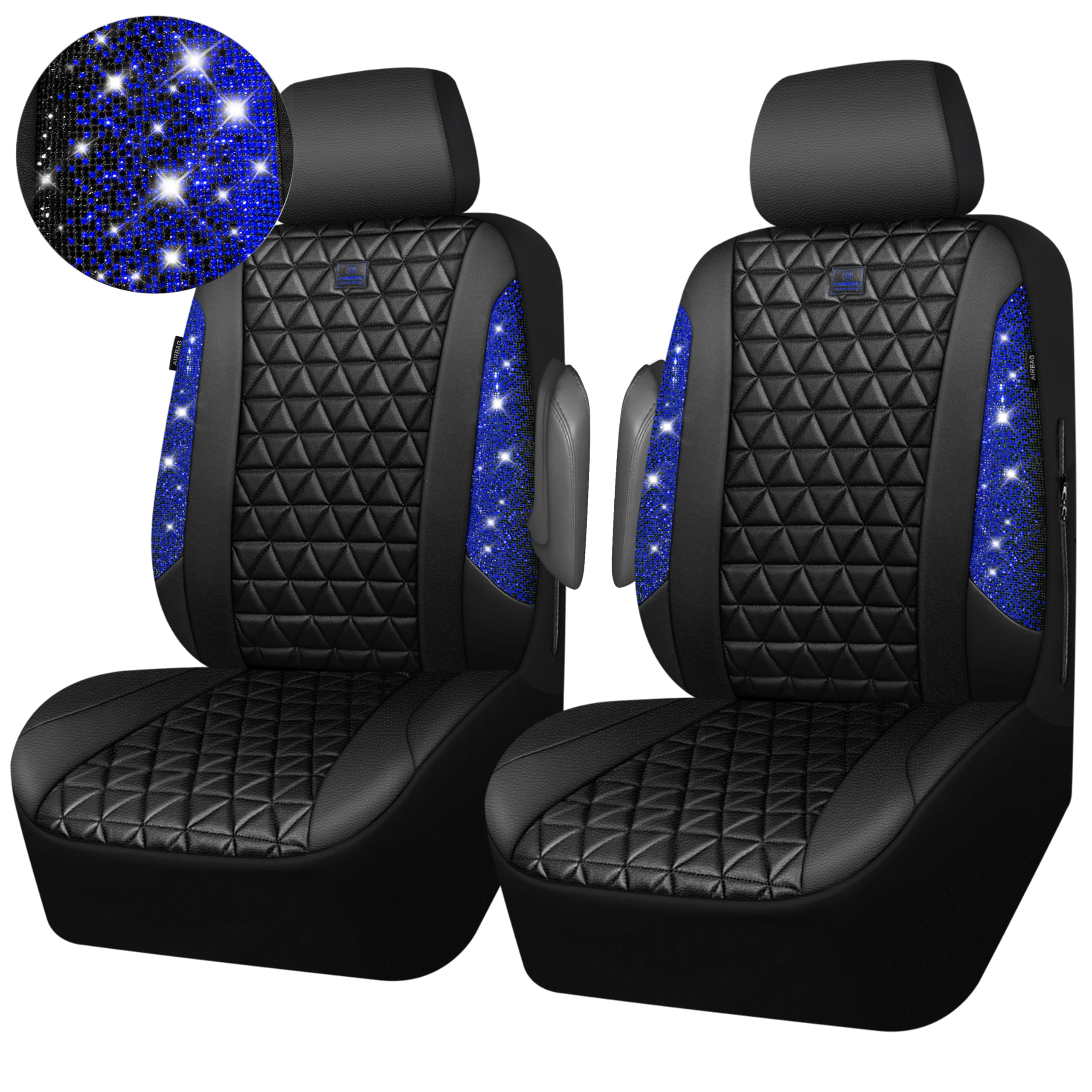 UNIVERSAL SPARKLY DIAMOND - Refresh your car if you install the bing bling crystal diamond leather seat covers, water resistant material. Surface rhombic texture design lined sponge soft and comfortable. Fit for most SUV Sedan Pickup coupe automobile vehicle seats with adjustable headrests. Can be installed with the detachable headrests. Easy to install, with installation manual, can be installed in 10 minutes