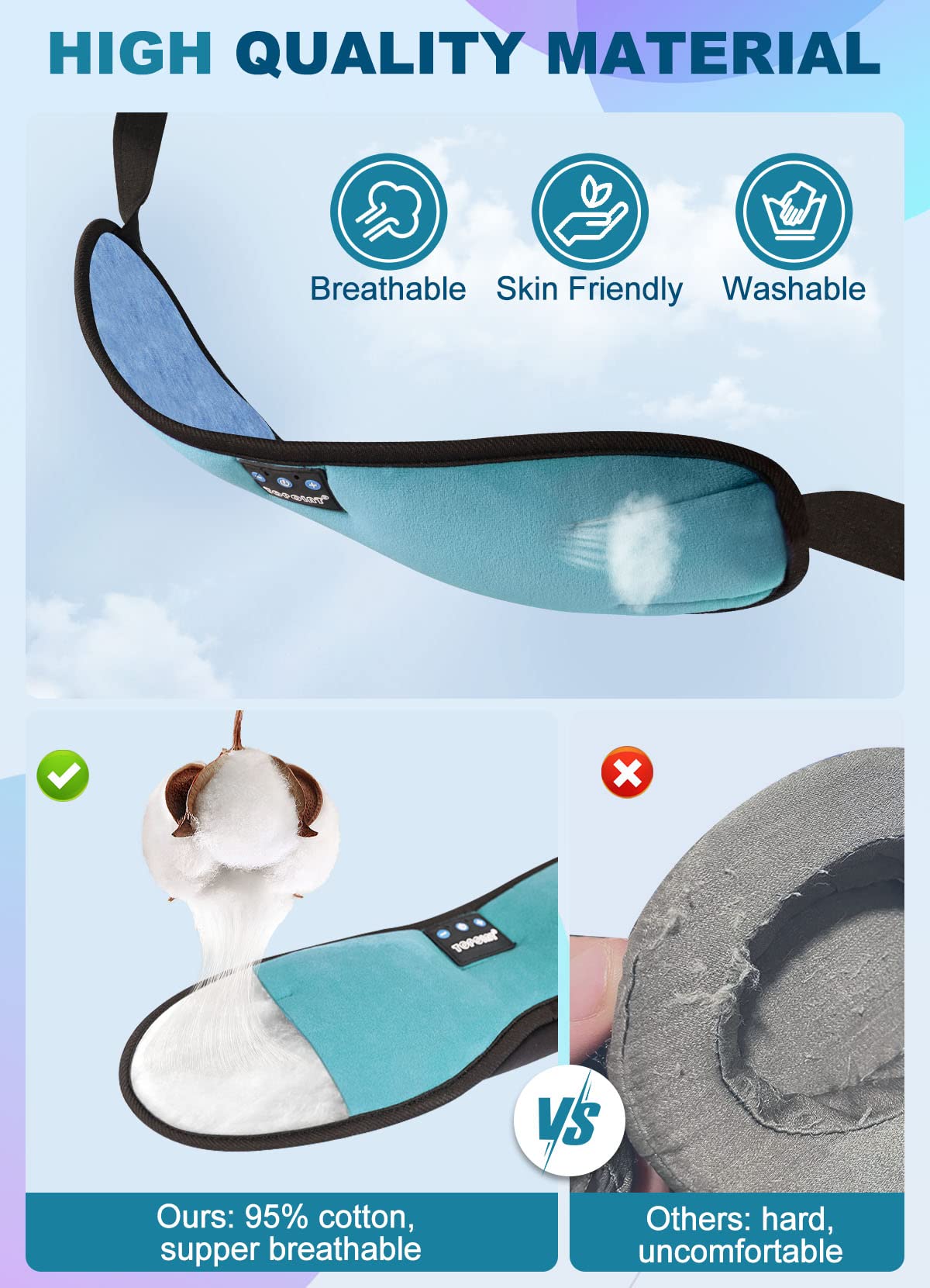 95% 5A COTTON SLEEP MASK: TOPOINT Sleep Mask is made from soft and elastic 95% cotton,provides a warm and soft feeling, perfect for chilly seniors to cold. Fabric liner of the bluetooth eye mask headphones separated from stitching is not defective, it is the place to take out the bluetooth module, so you can full wash the bluetooth sleep mask.