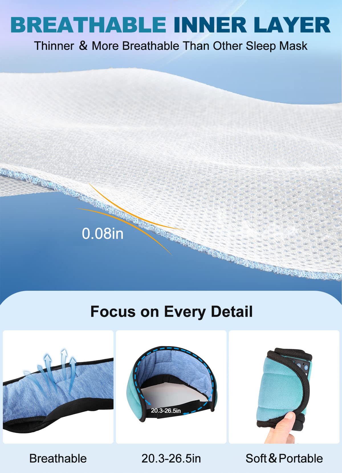 99.99% LIGHT BLOCK OUT: This bluetooth sleep mask for side sleepers adopt bending cartilage design, adjustable and durable. Bluetooth eye mask for sleeping thoroughly blocking lights coming from the nose area, get sound sleep or nap everywhere! Extra cushion makes sleep mask headphones and nose touch better, which completely block light. Sleep mask bluetooth best for frequent flyers to sleep on long flights or sensitive sleepers (insomnia) who dislike glaring lights in any occasions.