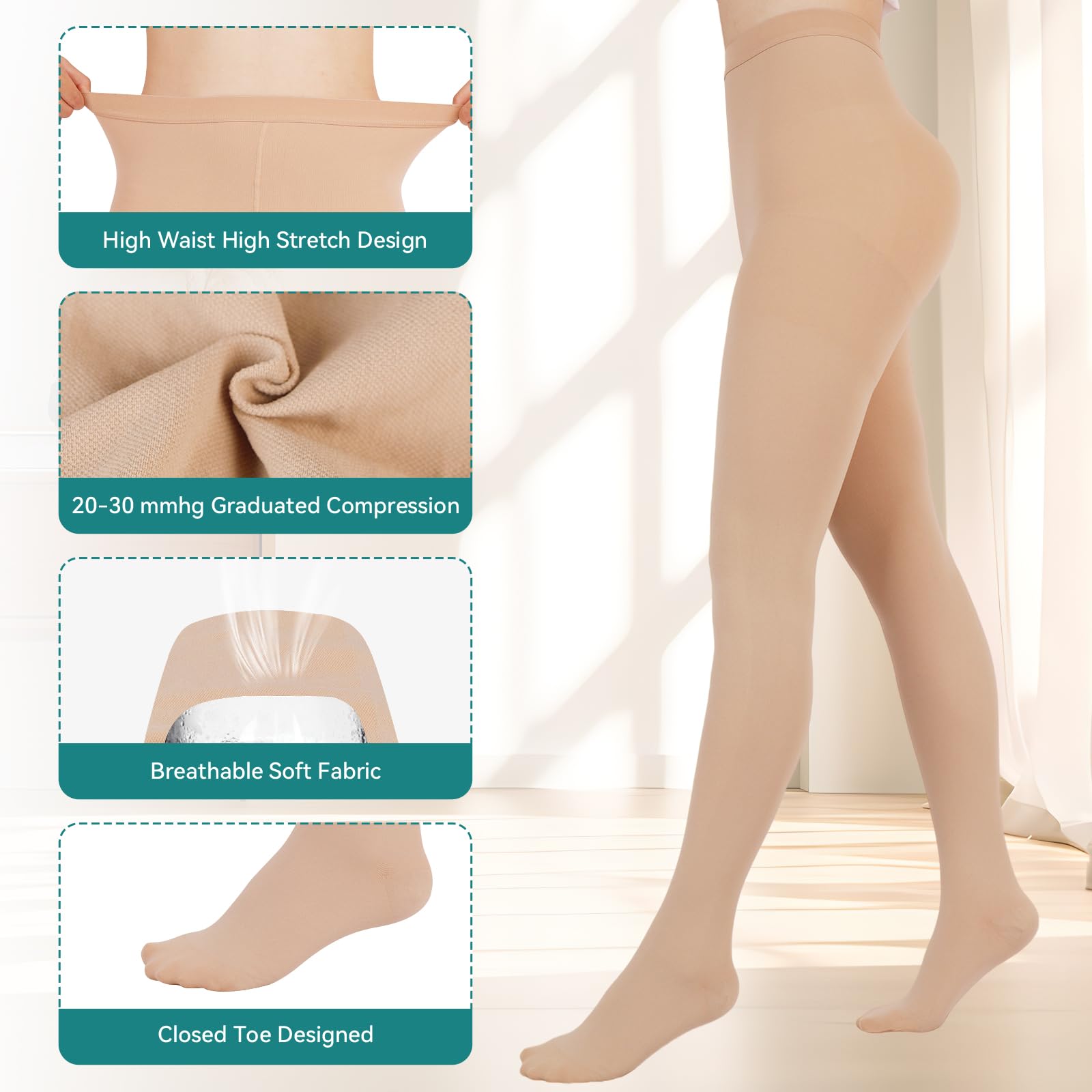 GRADUATED COMPRESSION: Compression stockings for women have graduated compression of 20-30 mmHg. The pressure is highest at the ankle and decreases gradually up the leg towards the heart. The compression tights help to reduce and prevent swelling for the person wearing them, and they help to keep the circulation and health of the legs.