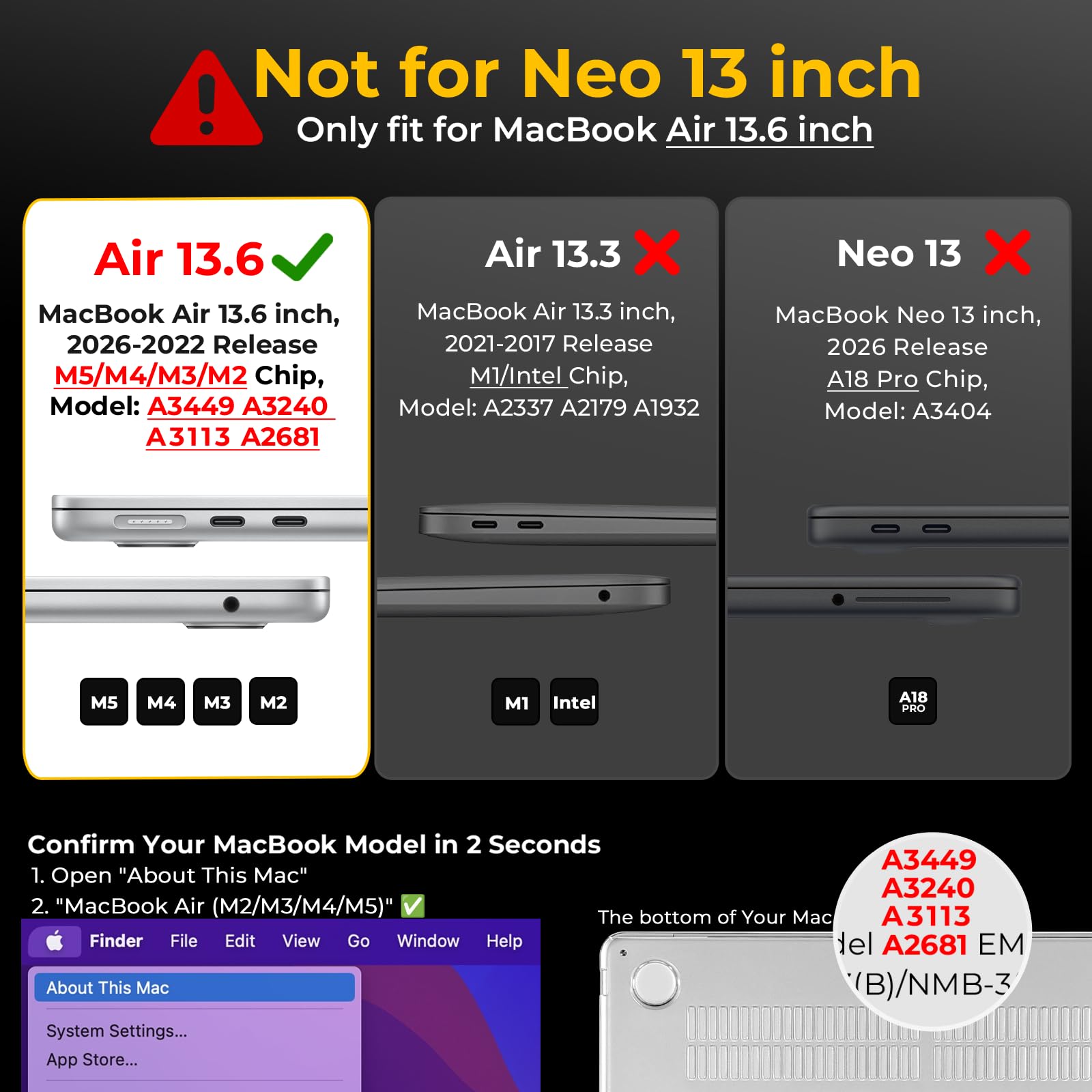 Perfect Fit: Only compatible with MacBook Air 13 inch case M5 M4 M3 M2 Chip 2026 2025 2024 2023 2022 Release with Liquid Retina display & Touch ID model number: A3449 & A3240 & A3113 & A2681- MC6T4LL/A, MW123LL/A, MW0W3LL/A, MW0Y3LL/A, MW103LL/A, MW0X3LL/A, MW133LL/A, MC6U4LL/A, MC6V4LL/A, MC6C4LL/A, MC654LL/A, MC6A4LL/A, MRXV3LL/A, MRXQ3LL/A, MRXN3LL/A, MRXT3LL/A, MXCV3LL/A, MXCT3LL/A, MXCR3LL/A, MXCU3LL/A, MLXW3LL/A, MLXX3LL/A, MLXY3LL/A, MLY03LL/A, MLY13LL/A, MLY23LL/A, MLY33LL/A, MLY43LL/A