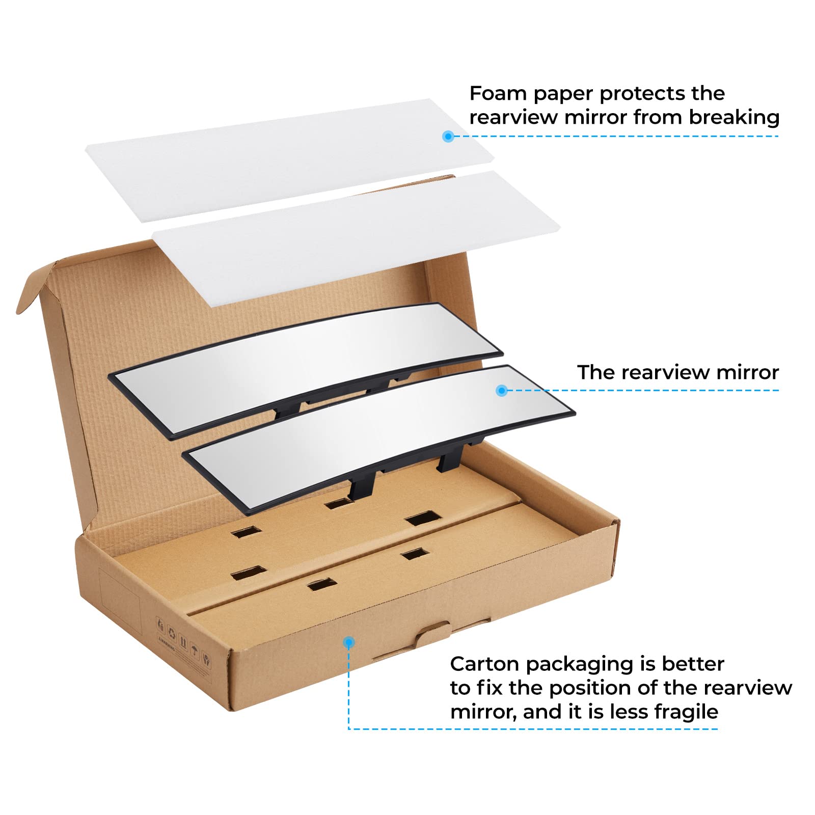 【ANTI-FALL】: We use a packaging carton to protect the mirror. Foam paper can prevent scratches on the surface of the mirror. There is a shelf inside the packaging box to fix the mirror. Even if it falls from a height of 2 meters, the mirror is still intact