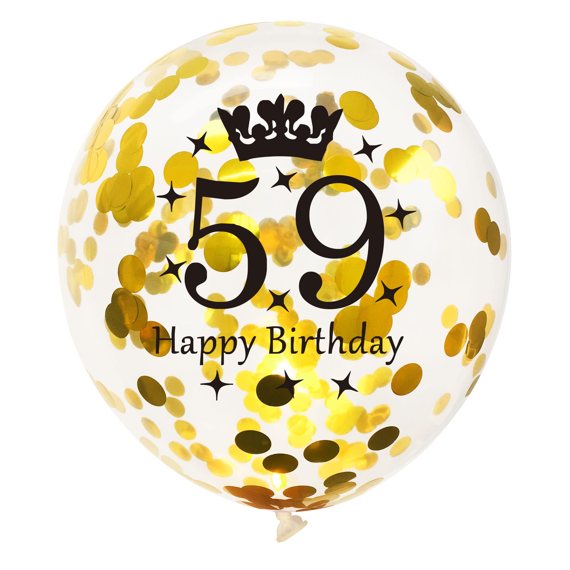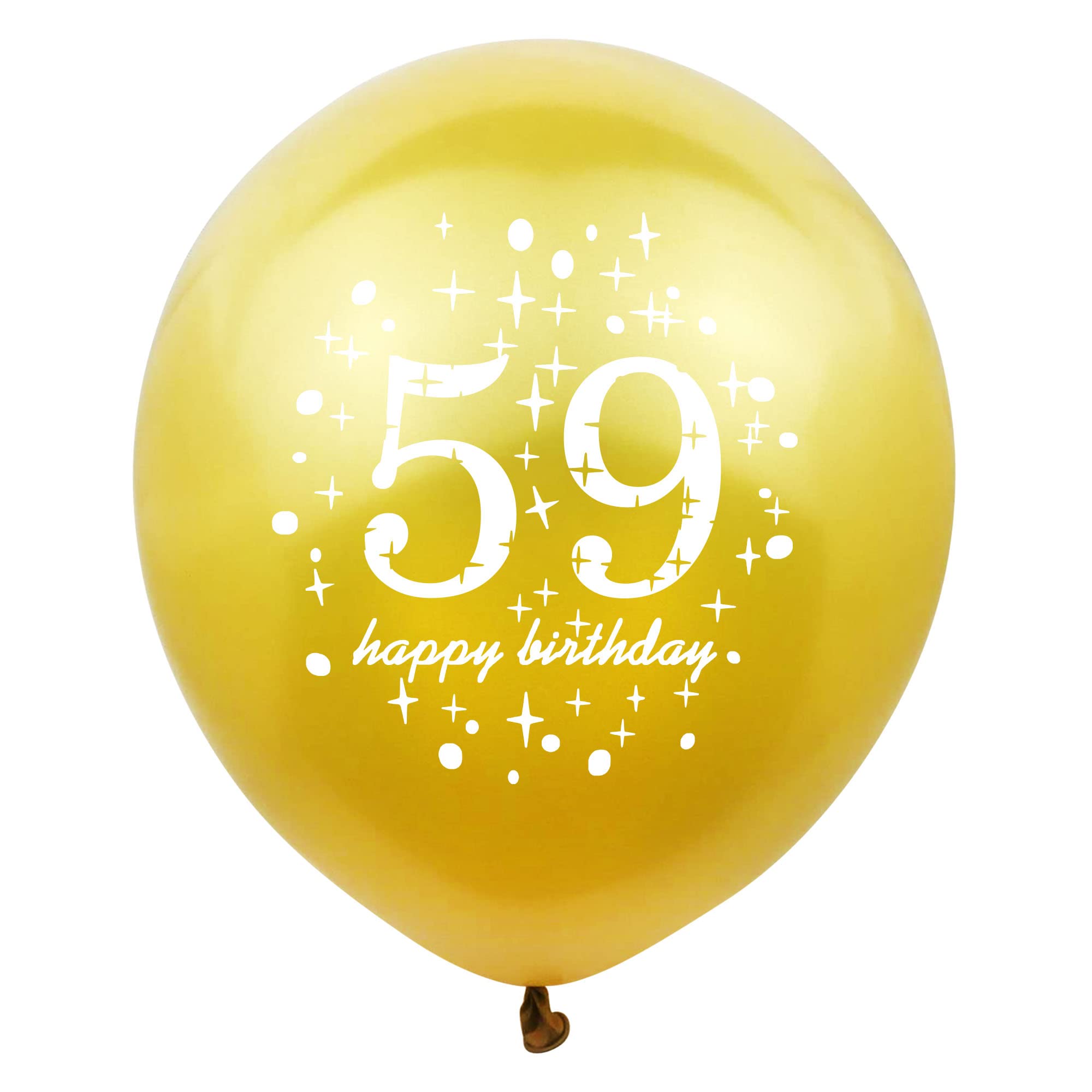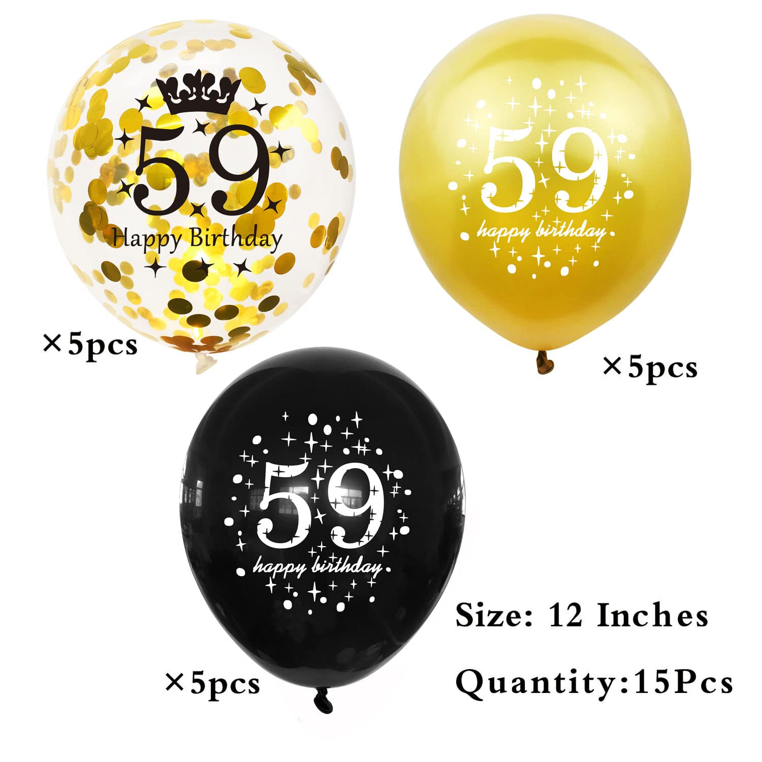 Package:5 pieces 12 inch black latex balloon printed with the words "59 Happy Birthday",5 pieces 12 inch gold latex balloon printed with the words"59 Happy Birthday",5 piece 12 inch gold confetti balloons printed with the words"59 Happy Birthday", very suitable for women men 59th birthday party decorations