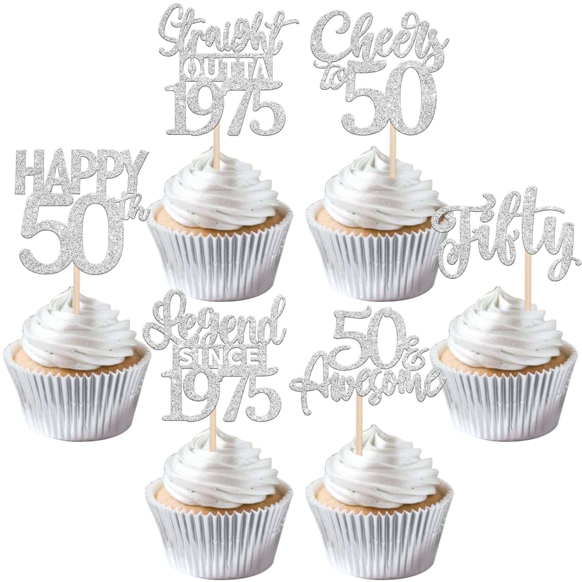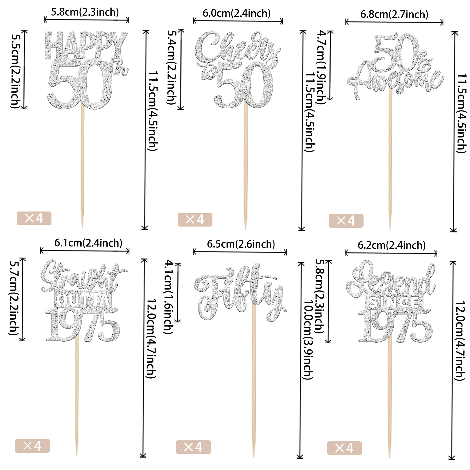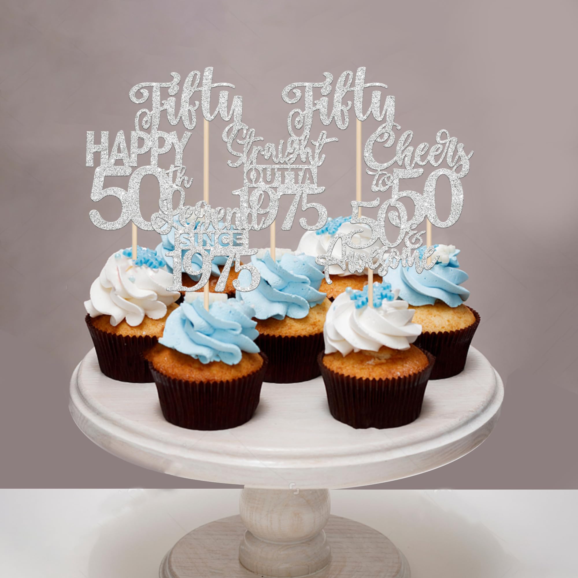 24PCS Happy 50th Birthday Cupcake Toppers Fifty Straight Outta 1975 Cupcake Picks Cheers to 50 Birthday Decorations Lengend Since 1975 Cupcake Decorations for 50th Birthday Anniversary Party Cake Decorations Supplies Perfect for legend since 1975 theme party, 50th anniversary theme party,cheers to 50 years theme party, 50 awesome theme party cupcake decorations supplies. Pack of 24 pcs,4 pcs of each design. The size is 2.3*4.5/ 2.4*4.5/ 2.7*4.5/ 2.4*4.7/ 2.6*3.9/ 2.4*4.7 inch ( with stick ) Made of high quality paper card stock,thick and sturdy. These straight outta 1975 cupcake toppers are one side glitter, another side is white, and they are intended for decoration only, please do not put them in oven or microwave. If the item you received has any defects, please contact us immediately.we will deal with it within 24 hours.