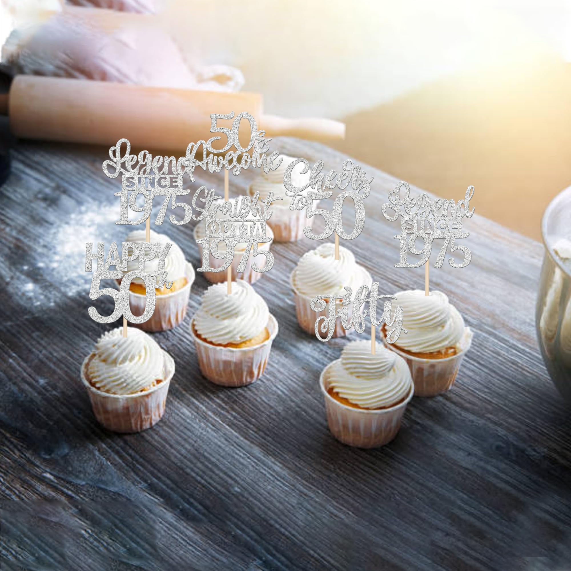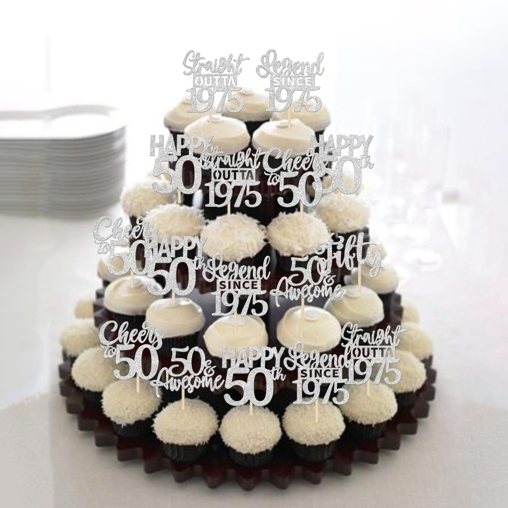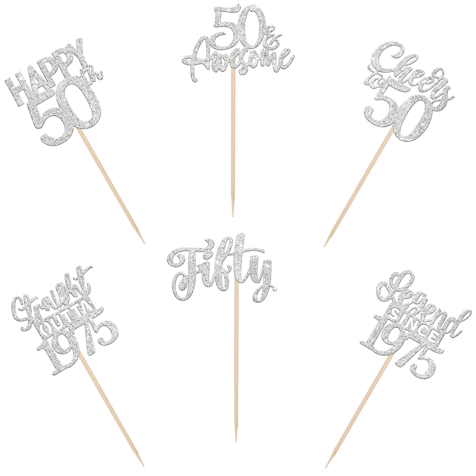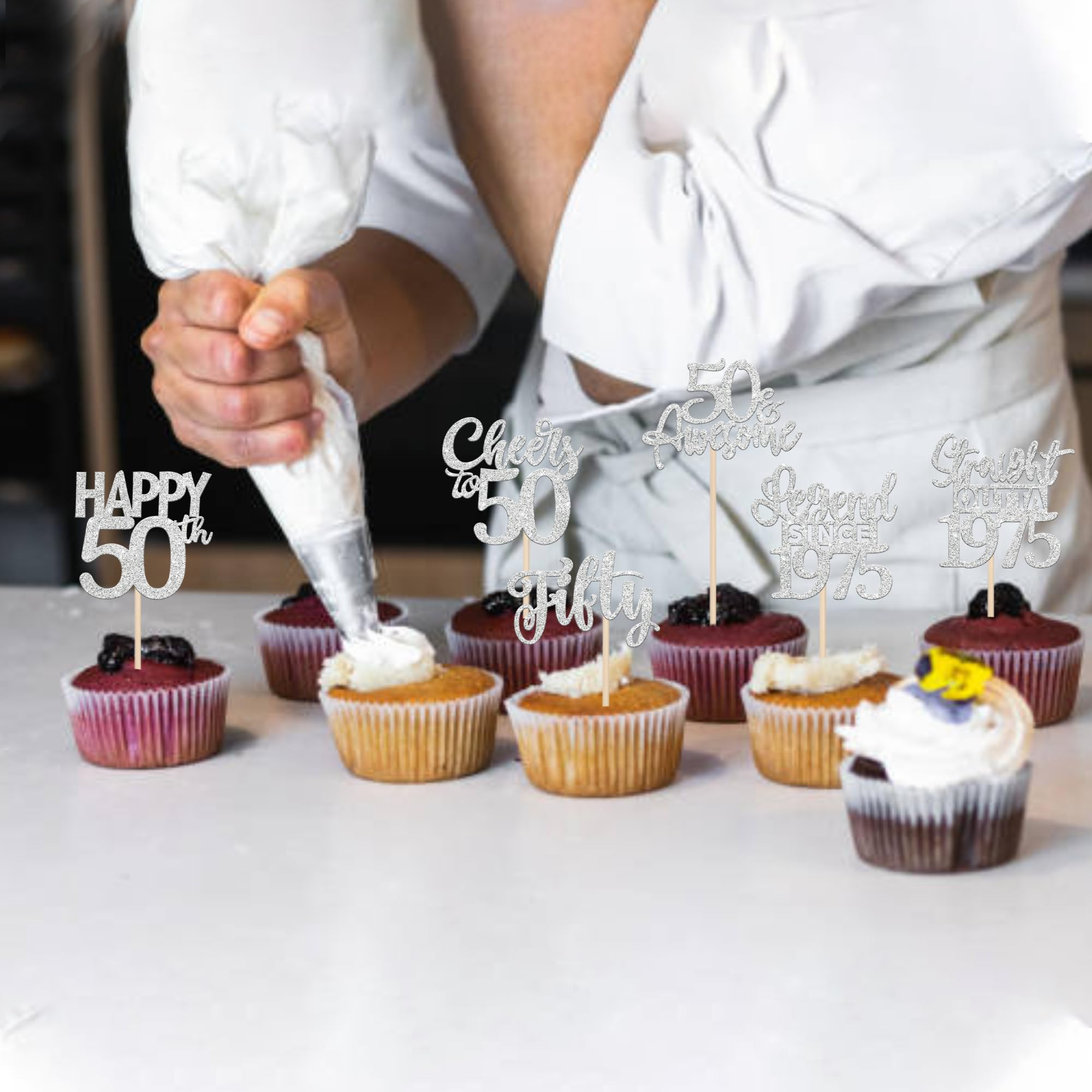 24PCS Happy 50th Birthday Cupcake Toppers Fifty Straight Outta 1975 Cupcake Picks Cheers to 50 Birthday Decorations Lengend Since 1975 Cupcake Decorations for 50th Birthday Anniversary Party Cake Decorations Supplies Perfect for legend since 1975 theme party, 50th anniversary theme party,cheers to 50 years theme party, 50 awesome theme party cupcake decorations supplies. Pack of 24 pcs,4 pcs of each design. The size is 2.3*4.5/ 2.4*4.5/ 2.7*4.5/ 2.4*4.7/ 2.6*3.9/ 2.4*4.7 inch ( with stick ) Made of high quality paper card stock,thick and sturdy. These straight outta 1975 cupcake toppers are one side glitter, another side is white, and they are intended for decoration only, please do not put them in oven or microwave. If the item you received has any defects, please contact us immediately.we will deal with it within 24 hours.