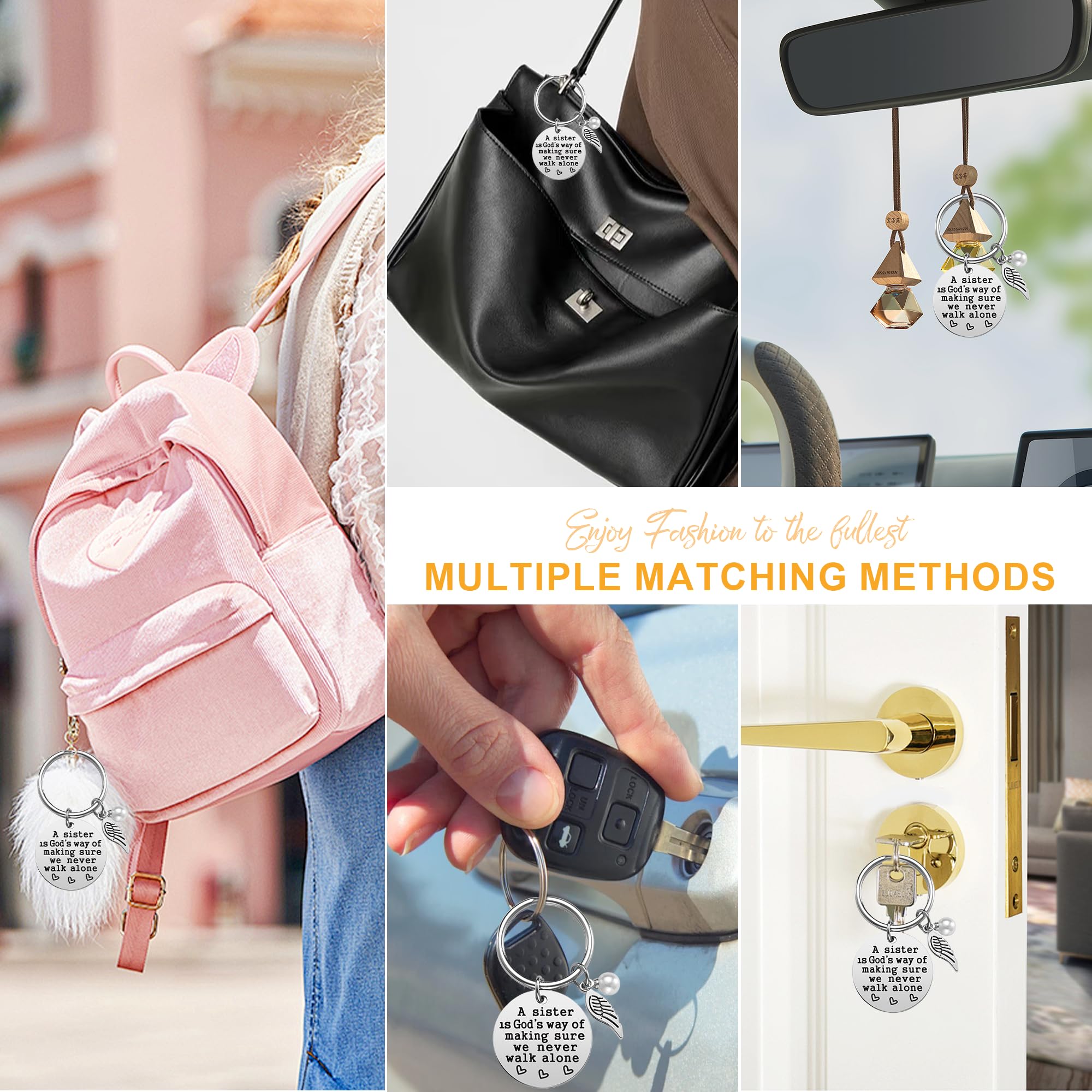 SUPER CUTE KEYCHAIN: Sister keychain composed of pearl, wing and pendant with engraving words