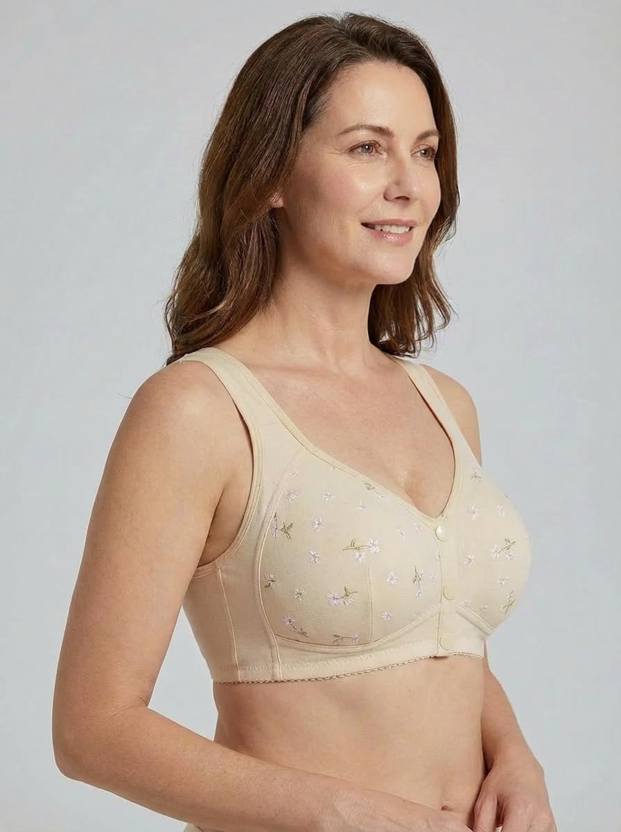 No underwire, Higher sides, Fuller cups, Wider straps, With daisy embellishments.