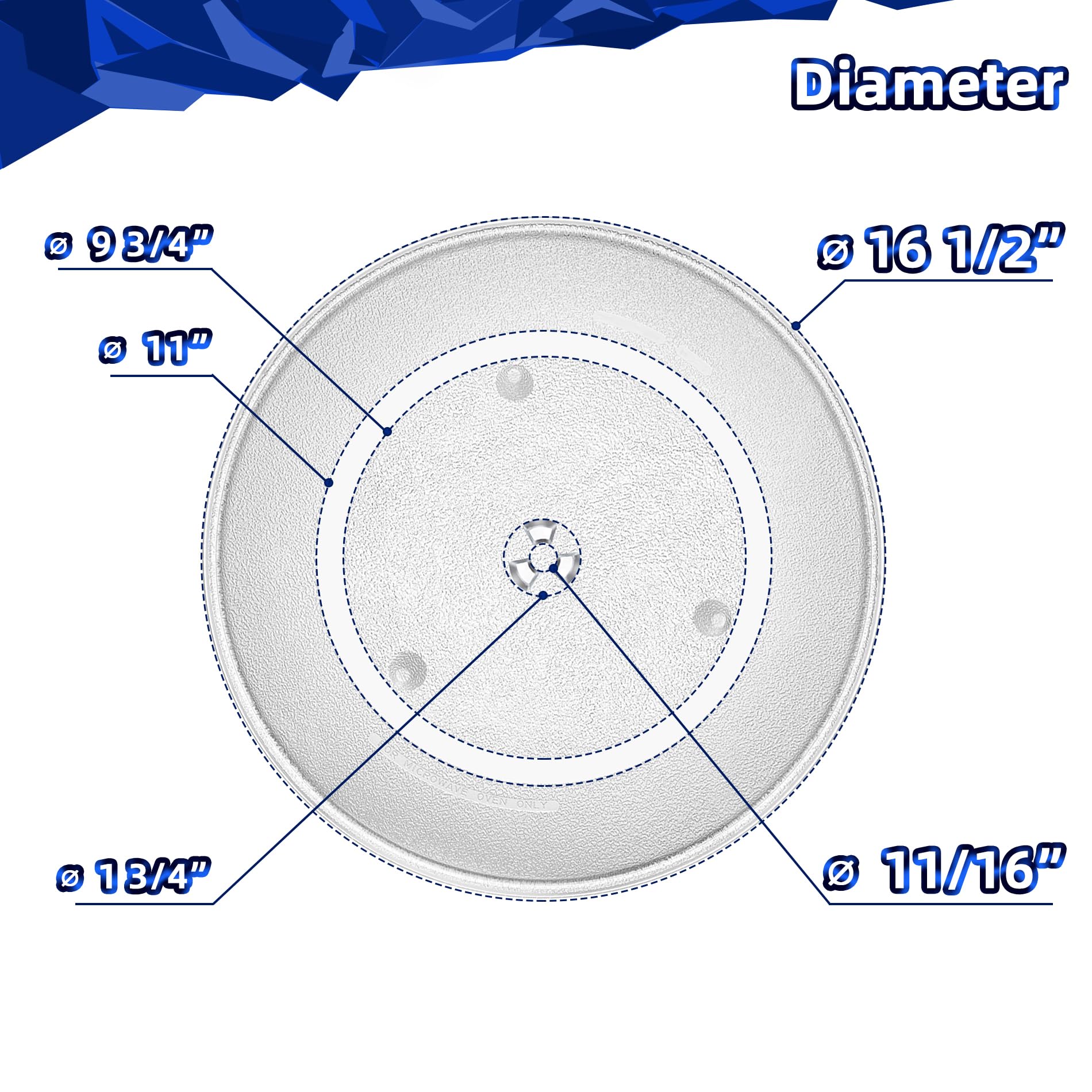 [16.5" MICROWAVE GLASS PLATE] - This microwave glass turntable plate measures 16-1/2 inches. The alignment of the notches to the bushing coupler is critical to ensuring compatibility. This turntable shall work with a turntable coupler that center spot measures 11/16 inch (the size of a dime) in diameter