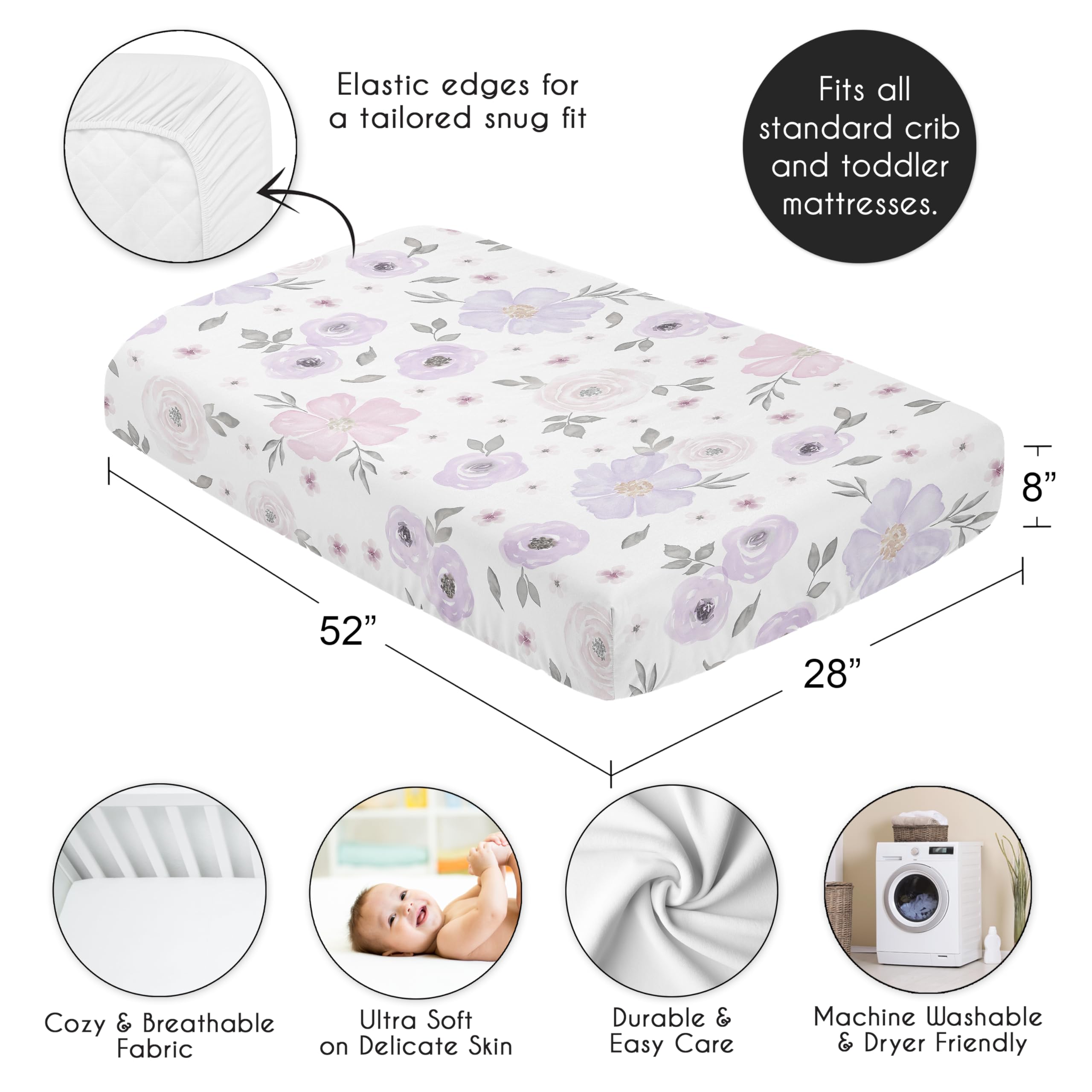 SNUG FIT: Includes (1) Fitted Crib Sheet 52in. x 28in. x 8in. Our newborn standard crib sheets fit snugly, with premium elastic sewn around the entire bottom edge for a secure fit on most standard sized cribs & toddler beds, to reduce shifting & bunching. This brushed microfiber crib sheet features an exclusive design of purple lavender and grey shabby chic, boho farmhouse, bohemian, garden, watercolor flower rose, floral print & is gentle on delicate skin to foster a soothing sleep environment.