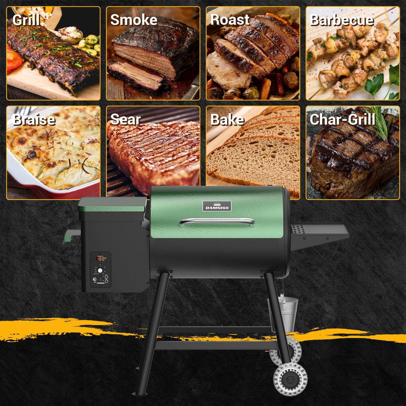 8-IN-1 VERSATILITY: The DAMNISS wood smoker grill offers a generous 456 sq. in. grilling space, making it perfect for entertaining groups or cooking multiple dishes simultaneously. It provides the flexibility to smoke, bake, roast, sear, braise, barbecue, and char-grill food with healthy wood pellets while bidding farewell to gas or charcoal
