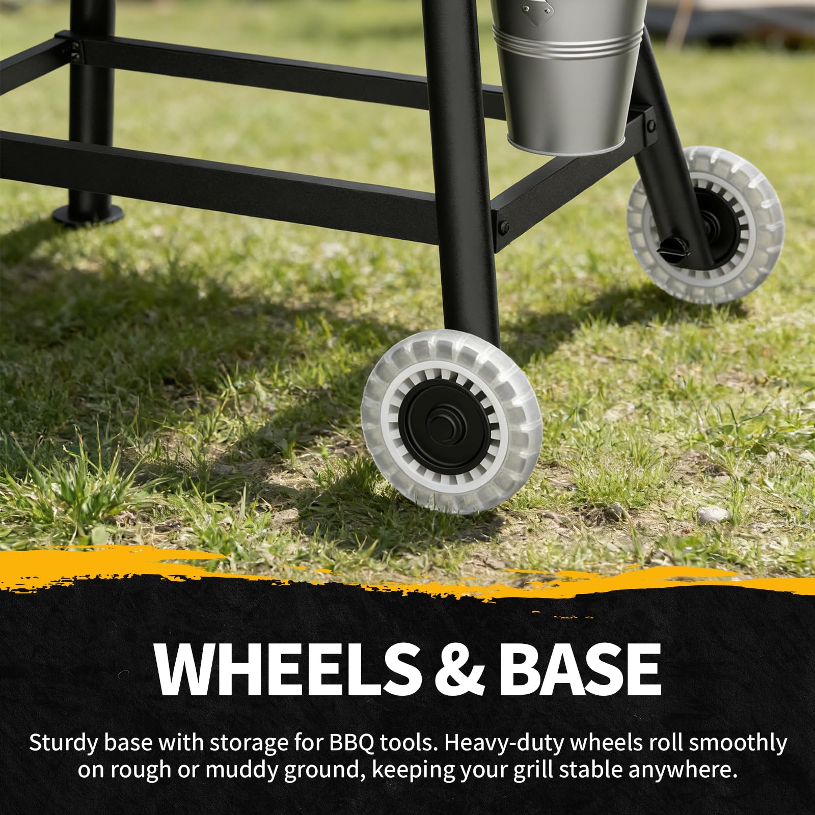 WITH WHEELS AND MEAT PROBE: The addition of 2 rugged smooth wheels enhances portability allowing easy maneuvering across various terrains including grass mud snow or sand. A meat probe is also included