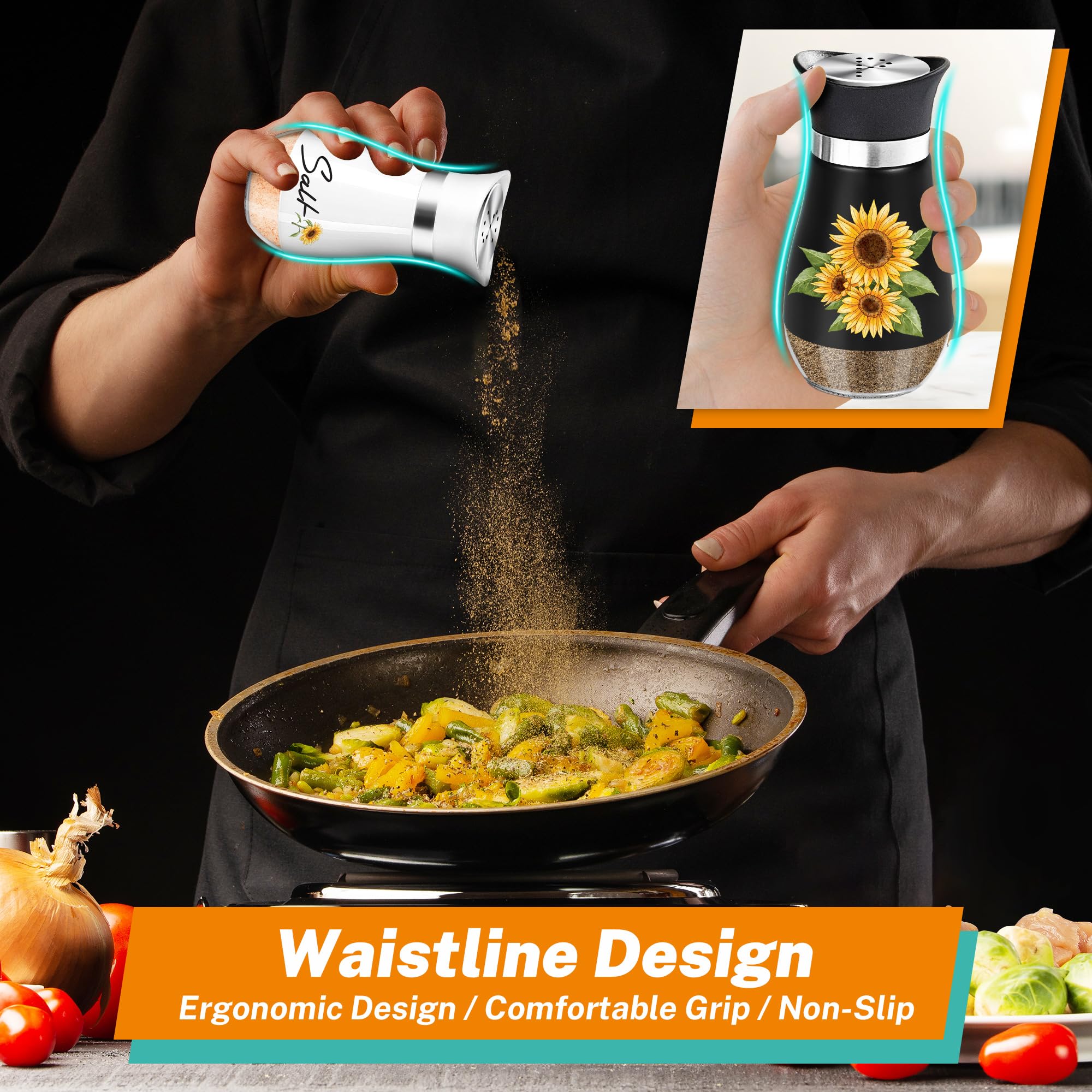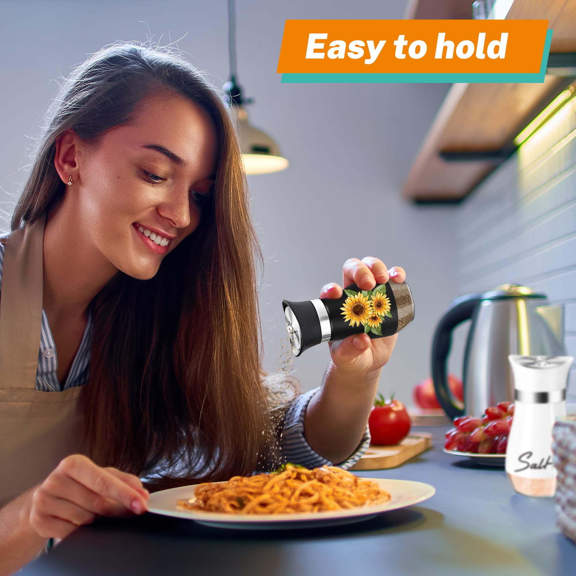 Season with Sunshine:Adorable sunflower salt and pepper shakers add a touch of rustic charm to your kitchen and table, infusing a vibrant country atmosphere. Their size about 4.3”x 1.6", with the capacity of 4 oz and holding 1/2 cup of spices, this set is the perfect size to cut down on constant refills without being bulky. When you do have to refill, the clear glass bottom will let you know when it's time