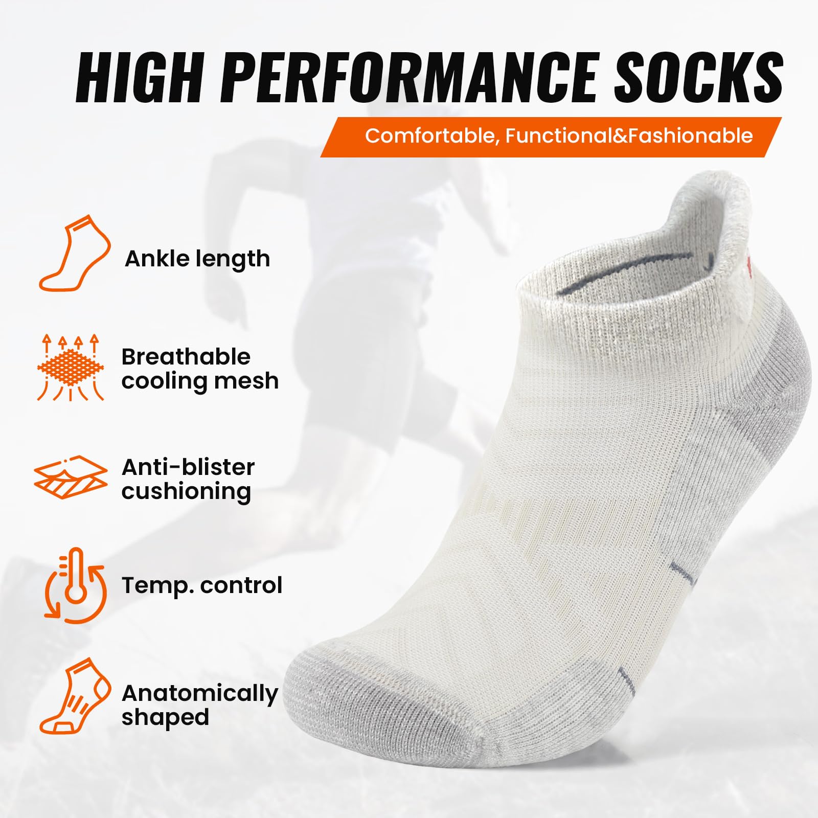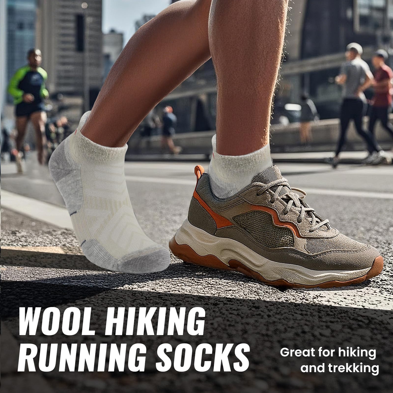 PROTECTION FOR FEET - These mens wool running ankle socks have stretchy cuff and arch support, which can have great compression support to reduce fatigue, protect the Achilles tendon, promote comfort during prolonged wear, and keep socks fit snugly. Cushioned sole absorbs shock and helps minimize blister risks during 10km+ hikes. Pull tab resist abrasion and prevent slipping. All of these provide more protection for your feet.