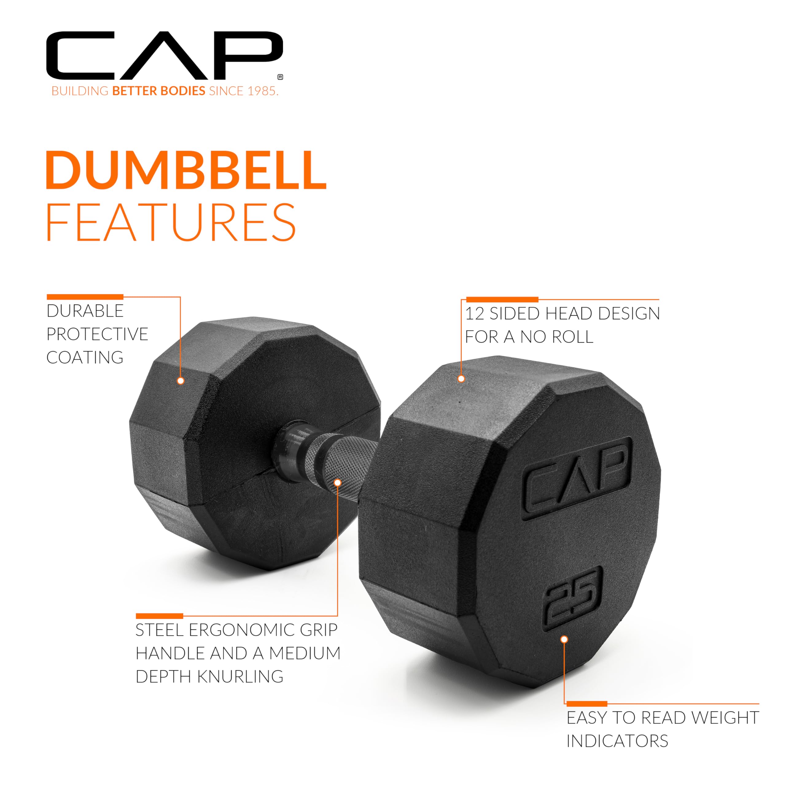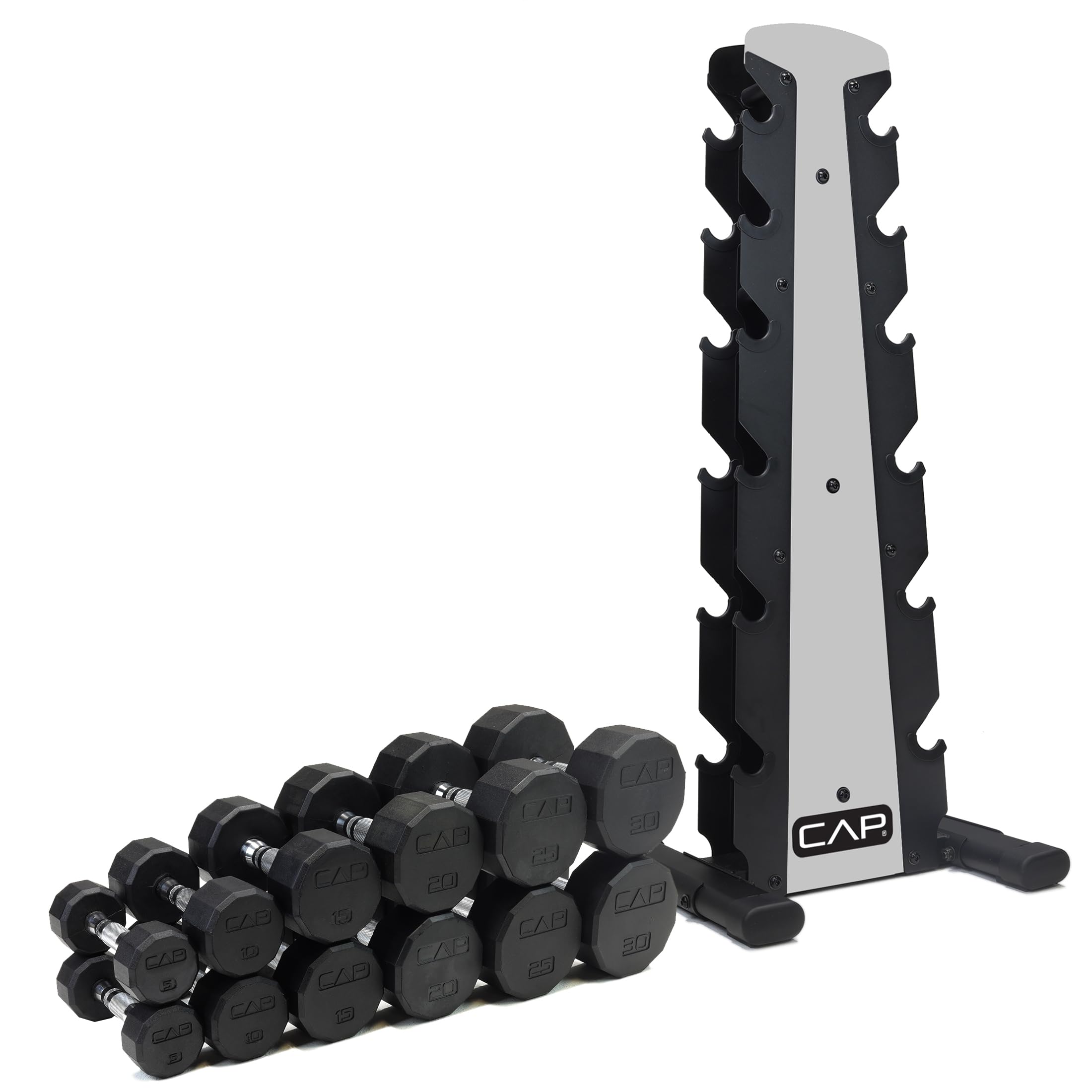 The CAP 210 LB Coated 12-Sided Dumbbell Weight Set with Silver A-Frame Rack will add versatility, storage space, and reliability to your home gym. This set includes a pair of 5-pound, 10-pound, 15-pound, 20-pound, 25-pound and 30-pound rubber 12-Sided dumbbell weights and an A-frame rack to store them. The FIVE pairs of dumbbells can be easily stored and accessed using the reliable, durable, space-saving A-frame rack. The dumbbell heads are made from ASTM A48 Class 20 grey iron coated in 80 shore hardness rubber joined together by a solid 1018 cold rolled steel chromed handle, making them durable and reliable. Use dumbbells to target specific muscle groups or add resistance to your strength training routine or HIIT workout. This set allows you to start with light resistance and build your way up to heavier weights, allowing you to attain the fitness goals you’ve set.