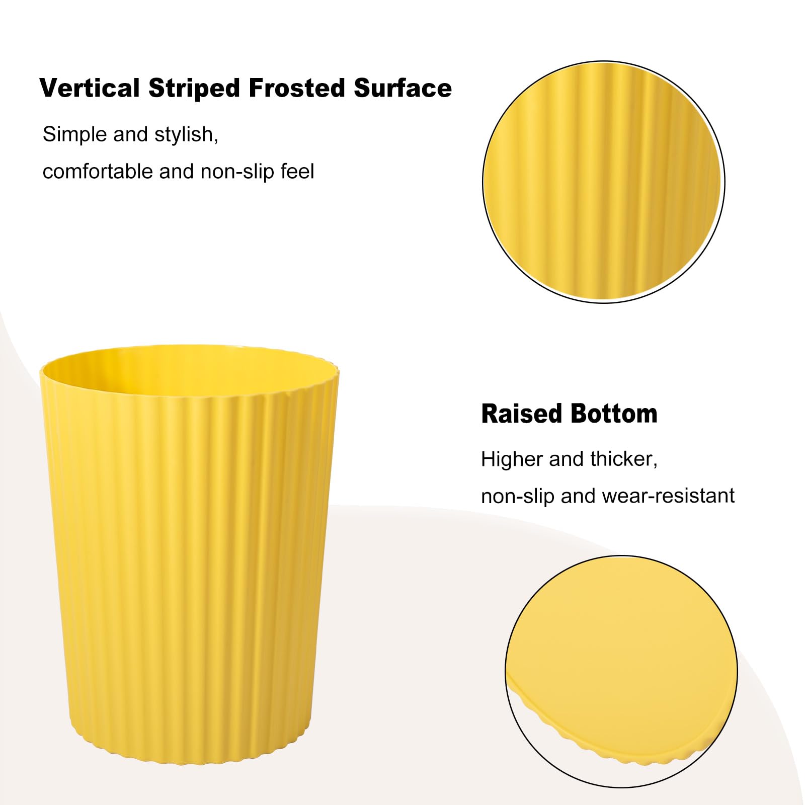 JiatuA Plastic Trash Can This multifunctional small trash can is exactly what you need in your daily life! Help you organize your home hygiene, make the house tidy and beautiful, and provide a trash can in a variety of colors to ensure that it matches any decoration. New Trash Can Advantages The bathroom wastebasket is made of high-quality thickened PP material, strong, durable, not easy to break. High capacity, bathroom garbage can collect most of the garbage to meet the needs of the family. Classic North Europe style, the unique vertical striped look of the trash can is a perfect decorative piece. Simple and stylish office trash can, matte frosted surface, non-slip and wear-resistant, easy to move, a must for families. The trash can has a heightened and thickened bottom to prevent it from tipping over or sliding on wet floors. The small wastebasket is perfect for your kitchen, bathroom, bedroom, office, bedroom. It is also great for apartment, condo, camper, RV, dorm room, cabin and tiny home. Garbage Can Specifications Size: 7.8 inches wide x 10 inches high Color: white, black, grey, teal blue, dark grey, pink, taro purple, navy blue, green, red, yellow, beige(multiple colors are available) Capacity: 1.8 gallon / 6.8 liter Weight: 0.639 pounds Packaging 1 X small trash can Customer Service Our goal is to win customer satisfaction through the best products and services. If you have any questions, please contact us. We will reply within 24 hours.