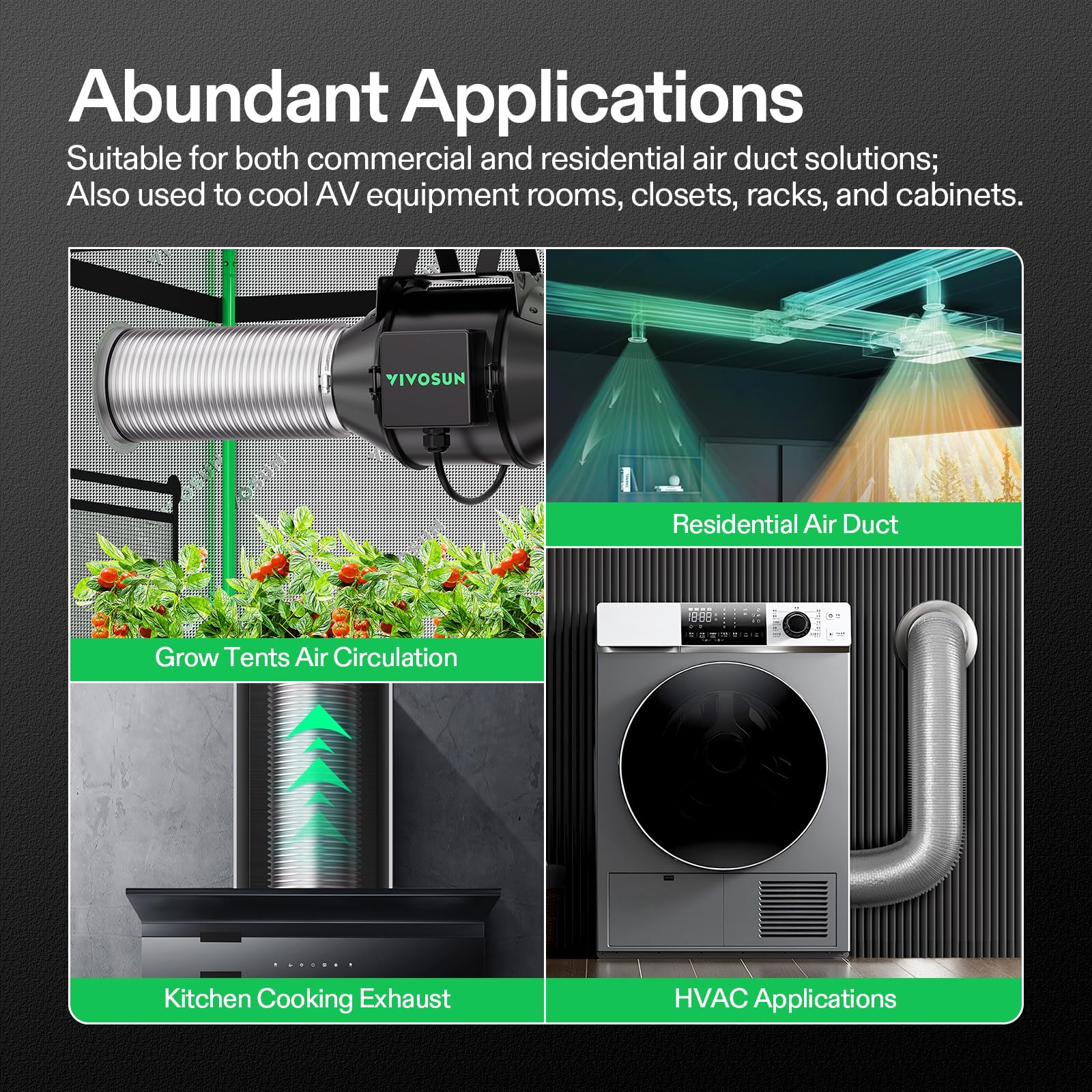 Abundant Applications: Suitable for both commercial and residential air duct solutions; Widely used in HVAC applications, bathroom venting, stove exhaust, dryer ventilation, kitchen cooking exhaust, planting room, or warmhouse air circulation, etc.; Also used to cool AV equipment rooms, closets, racks, and cabinets