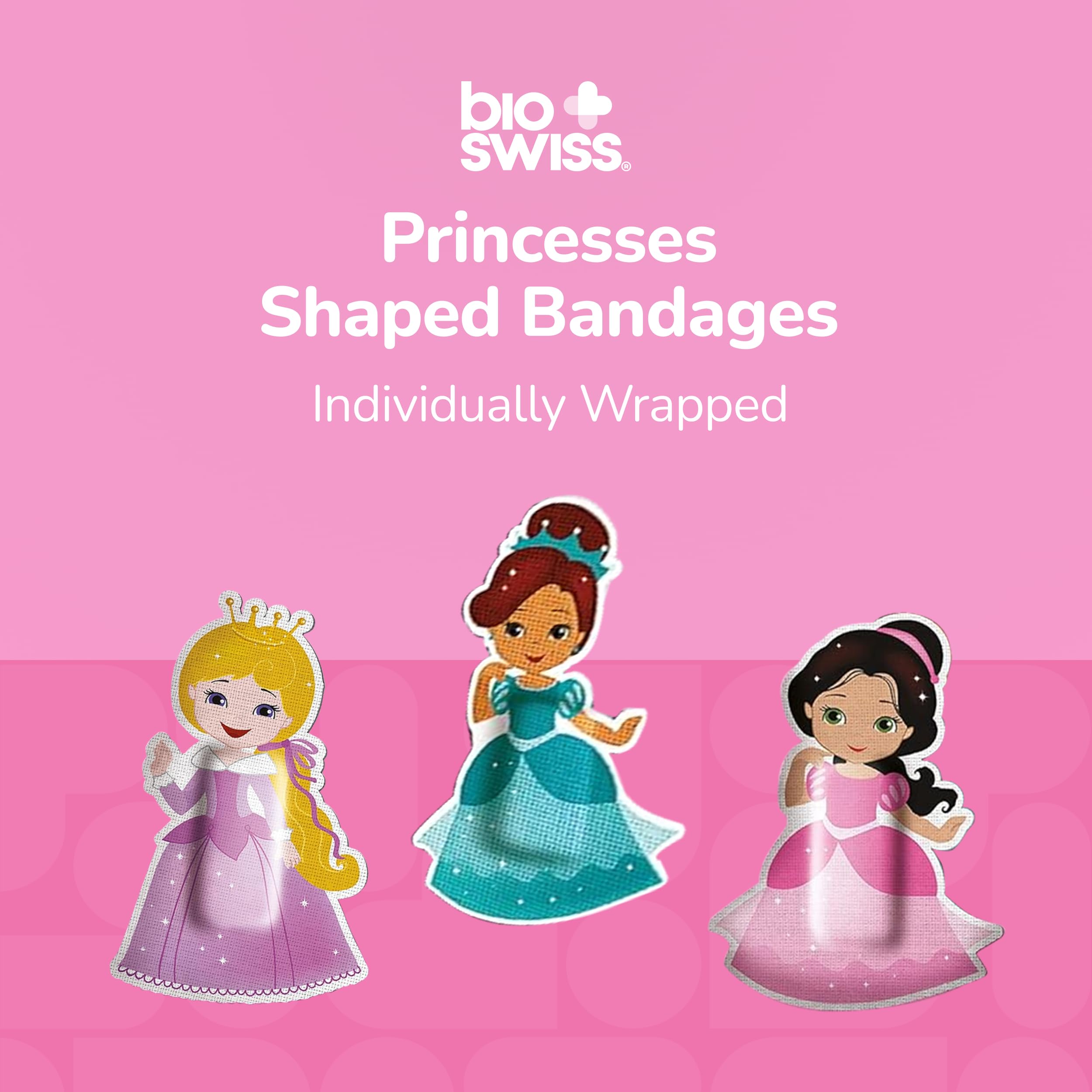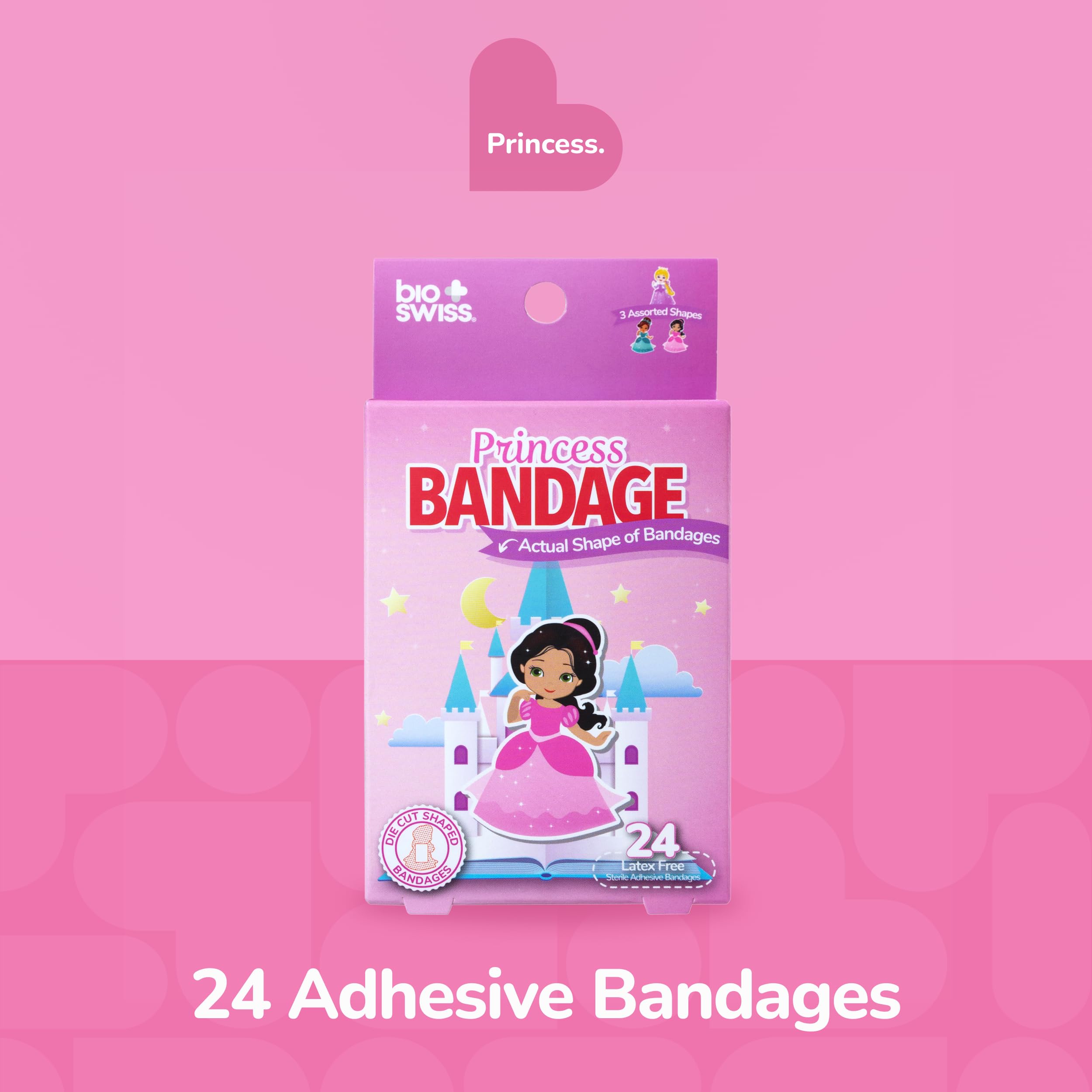 24 PRINCESS BANDAGES: Princess-shaped adhesive bandages pack helps protect cuts, scrapes, and minor wounds while making healing less stressful; bandages come in 3 assorted styles