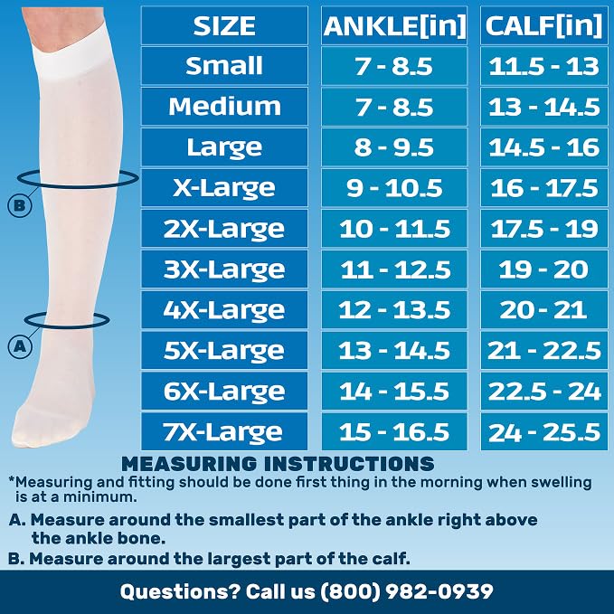 DETAILED SIZE CHART - Comprehensive size chart factoring in both calf and ankle measurements for a perfect fit.