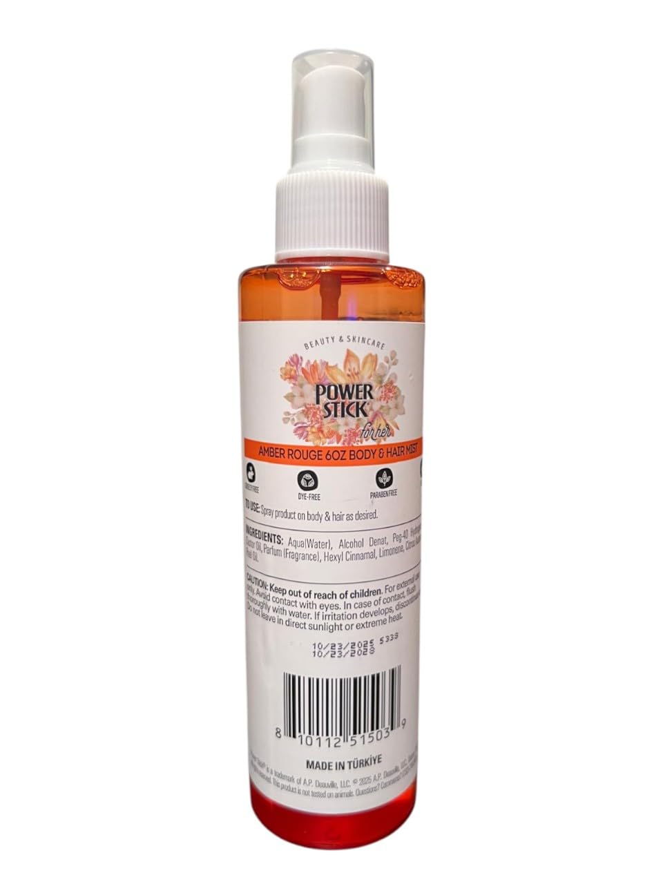 Power Stick for Her: Amber Rouge Body & Hair Mist Experience an instant sensory refresh with the Power Stick for Her Amber Rouge Body & Hair Mist. This versatile 6 fl. oz. spray is designed for the woman on the go, offering a sophisticated fusion of revitalizing and tranquil aromas that linger beautifully from head to toe. Whether you’re stepping out of the gym or heading into a late-night dinner, a few quick spritzes provide a sophisticated scent profile that bridges the gap between high-energy vibrance and calming elegance.