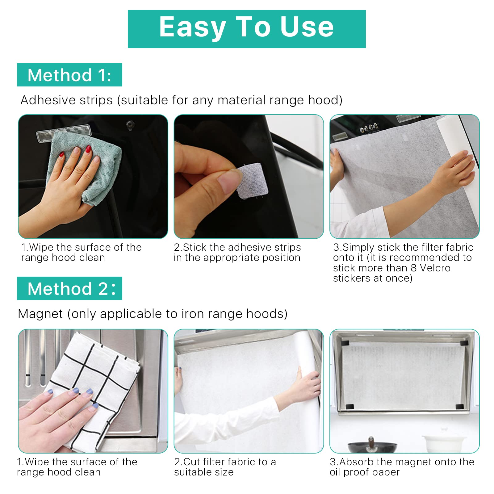 Easy to Use: Our range hood filter has a simple structure with adhesive strips and magnetic blocks that allows for quick replacement of old filters. There are 2 different installation methods to meet your material's range hood filter