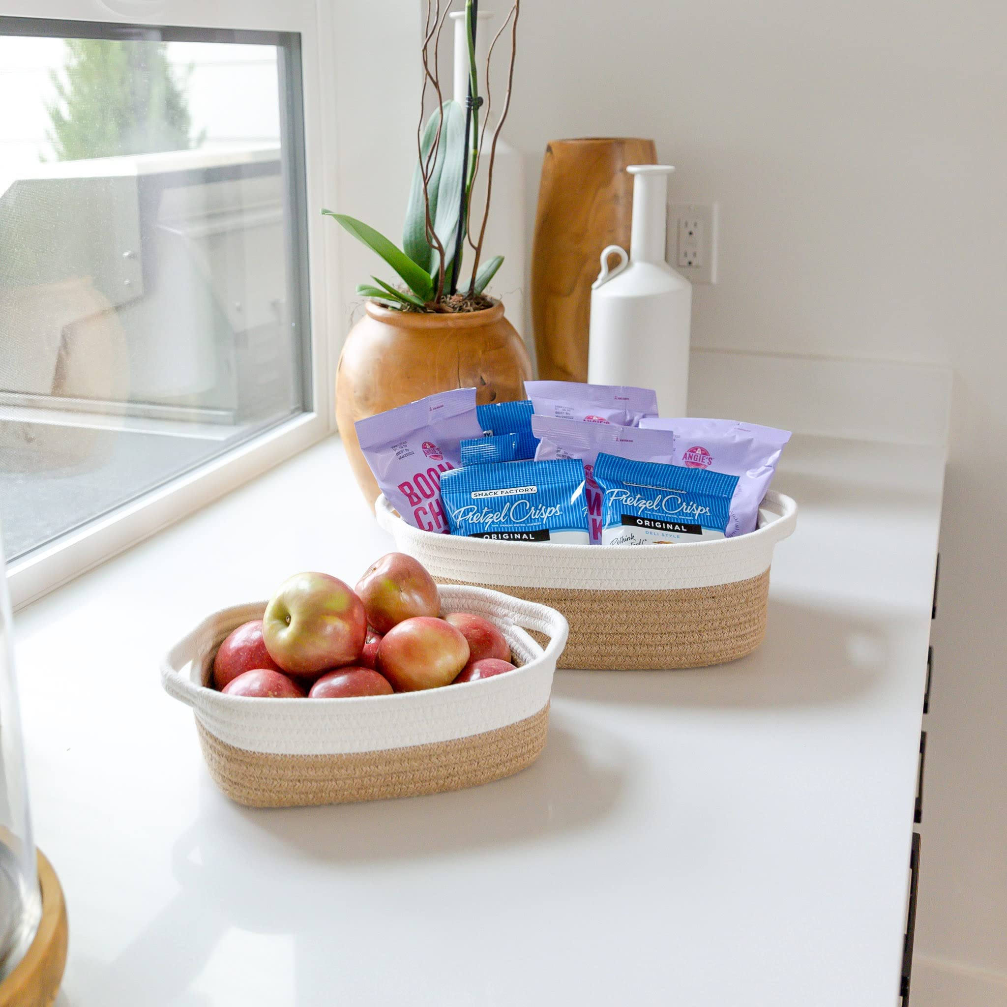 5 BASKETS FOR 5X THE ORGANIZING POWER: Life is messy...but your house doesn’t have to be! With 5 beautiful rope baskets for organizing, you’ll defeat messy rooms like a true supermom! Use the largest baskets for Montessori displays or countertop fruits holder, create the cutest dog toy storage or bathroom hand towel holder with the medium ones and stash jewelry or keys in the smallest. Biggest (11.8"x8.7"x4.3"), (11"x7.9"x3.9"), (10.2"x7.1"x3.5"), (9.1"x6.3"x3.1"), Smallest (7.9x5.5"x2.8")