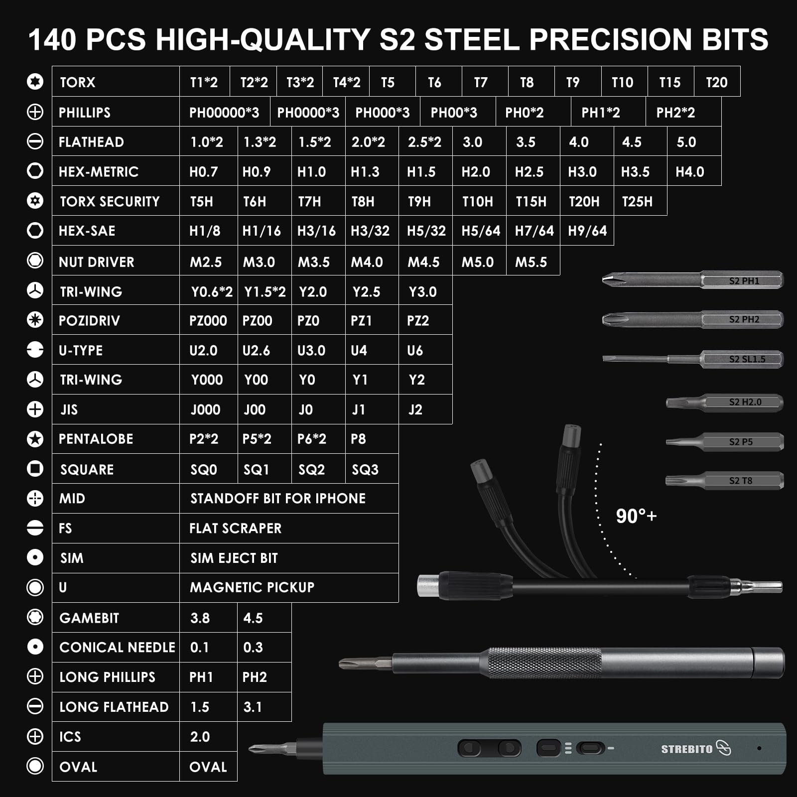 Complete Electric Screwdriver Kit: The STREBITO 155-piece small electric screwdriver set includes an electric screw driver, a manual screwdriver, 4 long bits, 136 common bits, and 13 additional repair tools. This comprehensive precision screwdriver set electric is ideal for repairing computer, laptop, cell phone, MacBook, RC car, drone, switch, PS4 PS5 console and controller, watches, and other IT tech devices