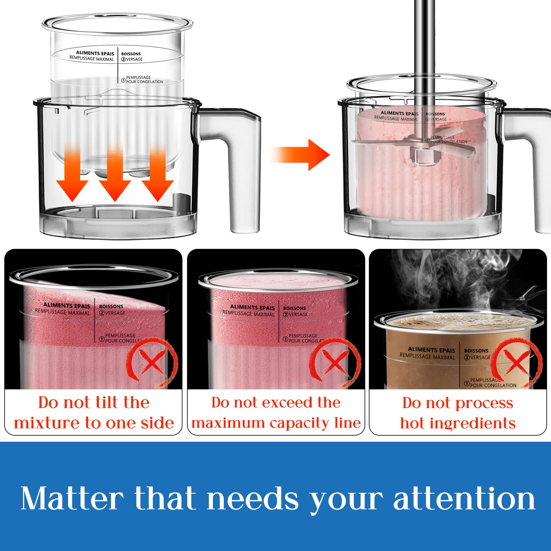 Notes: Do not exceed the maximum capacity line. Avoid rotating the mixture when the cup is tilted. Do not handle hot ingredients directly. If you have any questions, please contact us and we will solve it for you as soon as possible