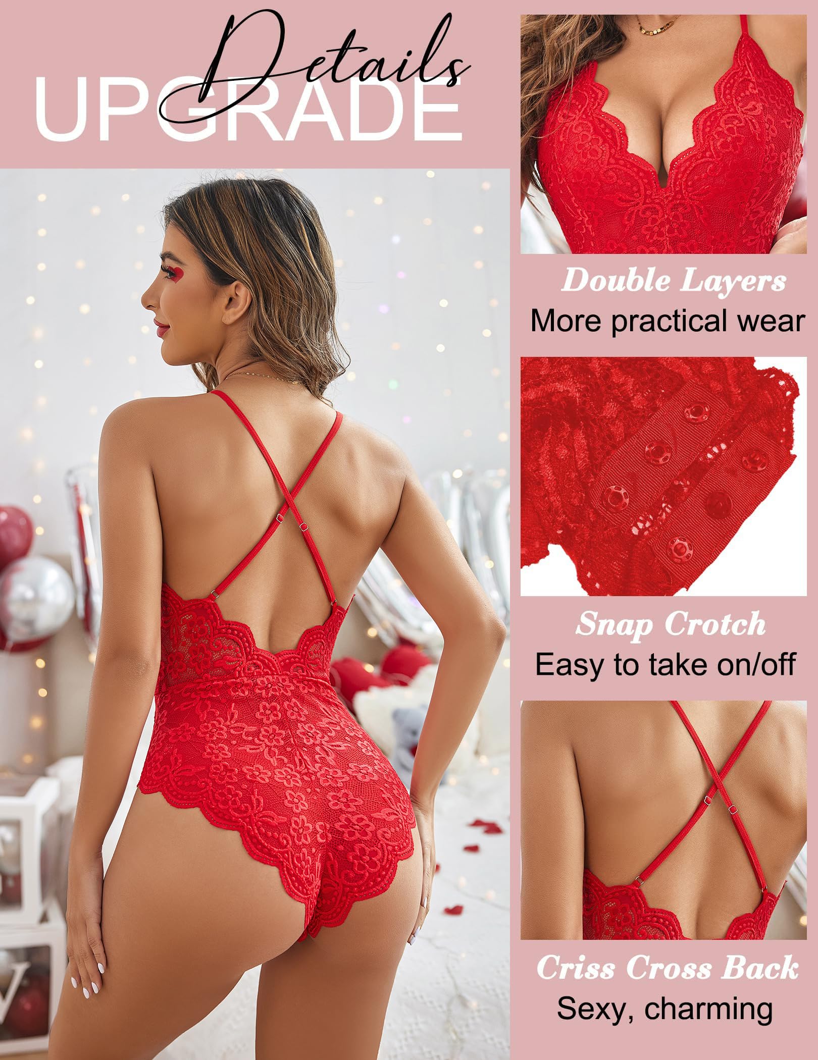 Lace bodysuit teddy lingerie for women features with stretch floral lace fabric, bodycon style slim to show off your curve, and adjustable criss cross straps allows for perfect fit.