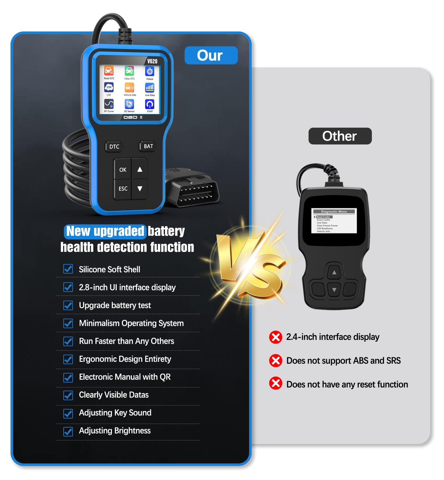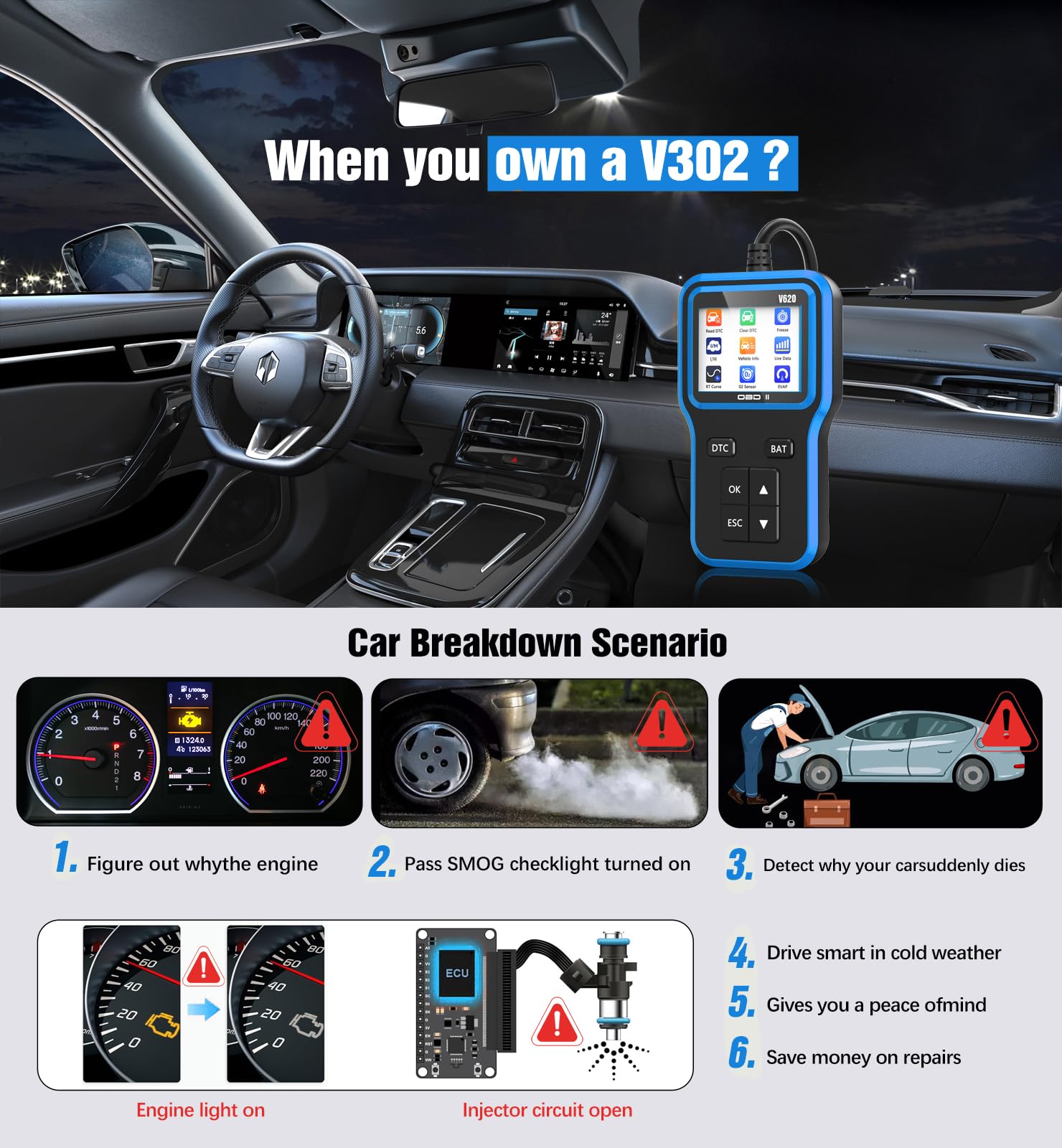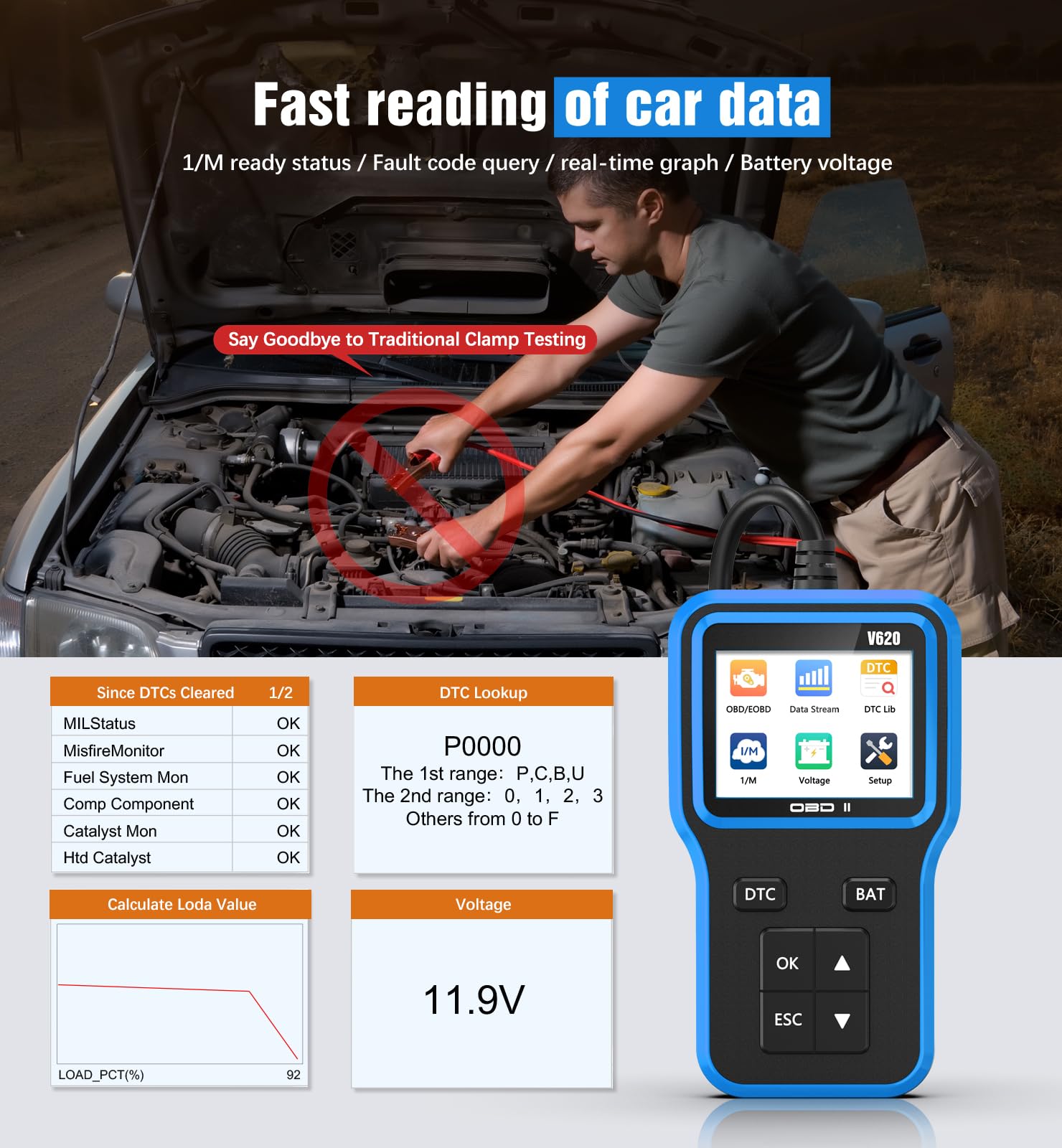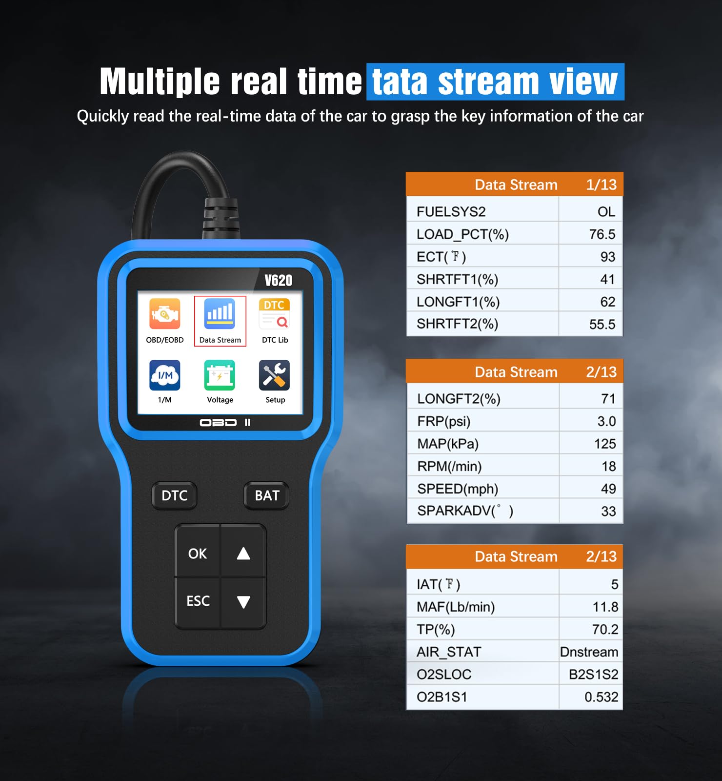 Battery Tester and Advanced OBDII System Diagnostics: This advanced code reader with battery has a built-in easy-to-use battery tester for monitoring battery life and voltage, helping you quickly assess the battery health of your vehicle, prevent unexpected failures and ensure reliable car performance. At the same time, this engine fault code reader provides advanced diagnostic functions, including testing the O2 sensor and EVAP system to measure oxygen concentration, control the amount of fuel injection, reduce fuel consumption, maintain optimal combustion conditions, improve engine efficiency; reduce exhaust emissions, and better protect the environment.
