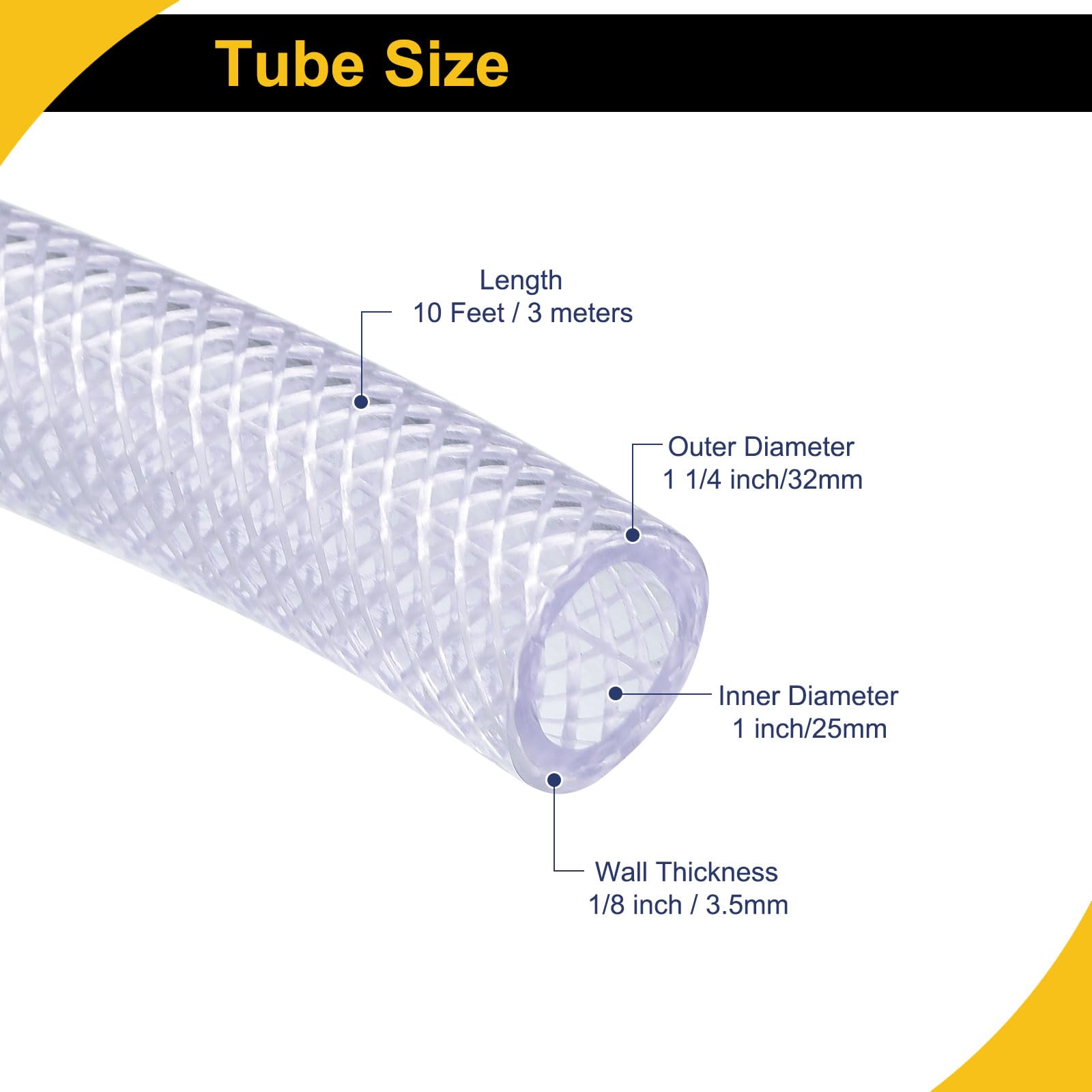 Length: 10 Feet / 3 meters; Inner Diameter: 1 inch/25mm; Outer Diameter: 1 1/4 inch/32mm; Wall Thickness: 1/8 inch / 3.5mm; Working Temperature range: 0℃ to 65℃(0℉ to 149℉).