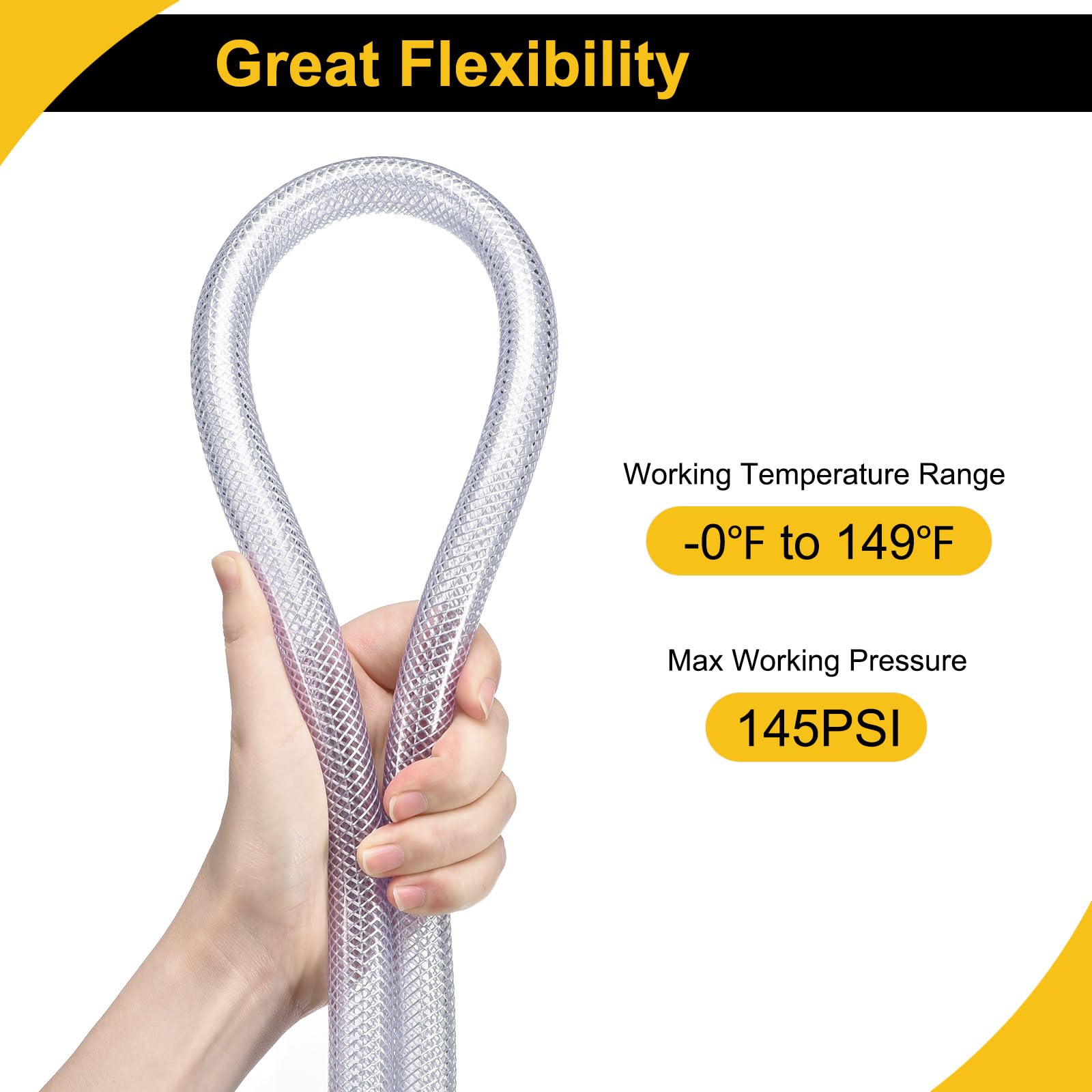 What is this? Our braided tube is made of PVC material and strength braided layer, for a longer service time, and the service time of our hose is 5 times of a general hose. What will I get? The PVC braided tube, we provide here, is in size of: Length: 50 Feet / 15.2 meters; Inner Diameter: 1/2 inch/12mm; Outer Diameter: 3/4 inch/18mm; Wall Thickness: 1/8 inch / 3mm; Working Temperature range: 0℃ to 65℃(0℉ to 149℉) In the package of 1 x PVC Tube Are there any advantages of the product? Our tube wall is designed thicker with braided layer for strong and high pressure resistance, wear resistance, acid resistance, alkali resistance, and corrosion resistance. How to use? The plastic tube is suitable for a wide range of applications, including plumbing, water filtration systems, air conditioning, hydroponics, air compressor hose, fluid transfer in industrial settings, and more. What should I notice? All the sizes are measured manually, please allow +/-0.2 inch error. Confirm the size before ordering.
