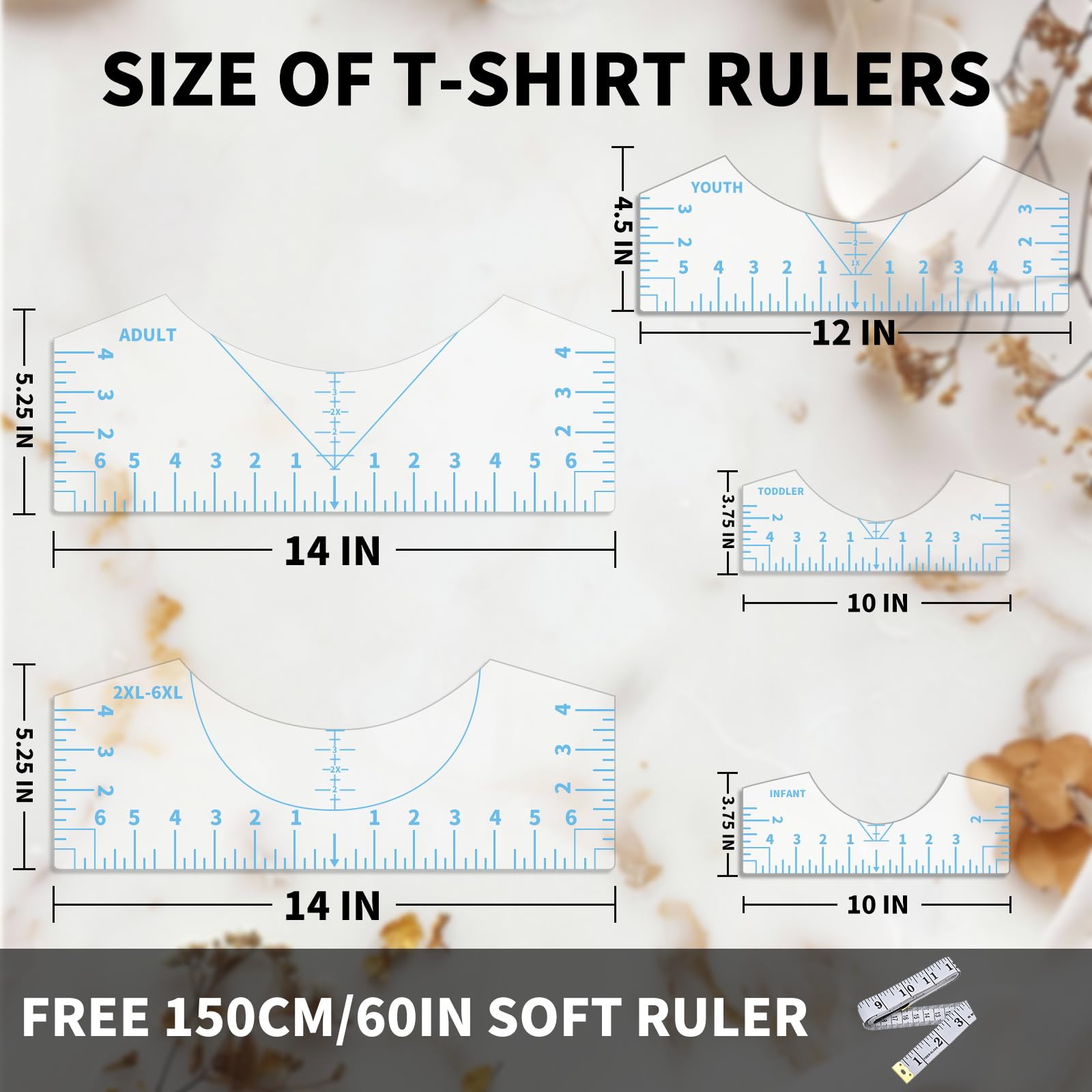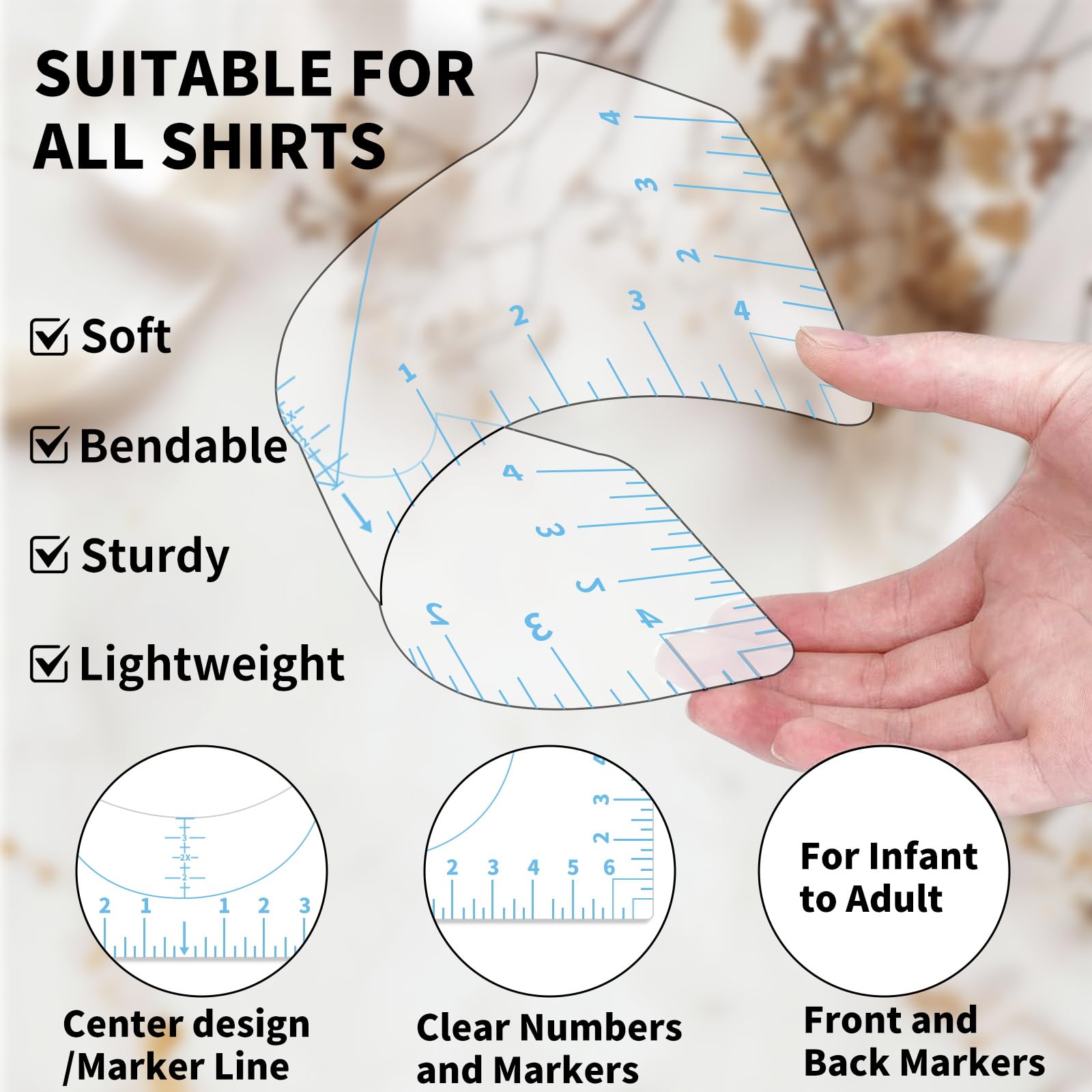 Designed to solve the problem of pattern positioning in shirt making, this T-shirt positioning tool set is a powerful assistant for improving production efficiency and accuracy. ★Its core advantage lies in easily solving pattern positioning problems, making it a "game changer" in shirt making. Simply align it with the shirt collar to quickly center the design pattern, eliminating the trouble of estimating by eye and saving a lot of time spent on repositioning and second - guessing. This ensures that every pattern placement is precise. ★The 5 T - shirt rulers in the set are made of upgraded high - quality PVC material, which is durable and soft. They can be twisted at will and are not as easy to break as acrylic materials. They can be reused, greatly extending their service life. In addition, their small and lightweight design makes them easy to carry, whether for home production or outdoor use. ★The numbers and markings on the rulers are printed with advanced UV printing technology, which are highly clear. They can be clearly seen and easily read even against almost any shirt color background, allowing you to have a clear view during the positioning process and avoiding positioning deviations caused by blurred markings. ★This tool set has a wide range of applications and is an ideal auxiliary tool for various production processes, including Cricut heat press, sublimation transfer, screen printing, iron - on vinyl, siser htv vinyl pressing, shirt printing, etc. It can perform well in both home sewing and commercial production, meeting the production needs of different scenarios. ★Whether you are a craft enthusiast making personalized shirts at home or a business engaged in mass production, this tool set can bring you a convenient and accurate user experience, making shirt making easier and more efficient.