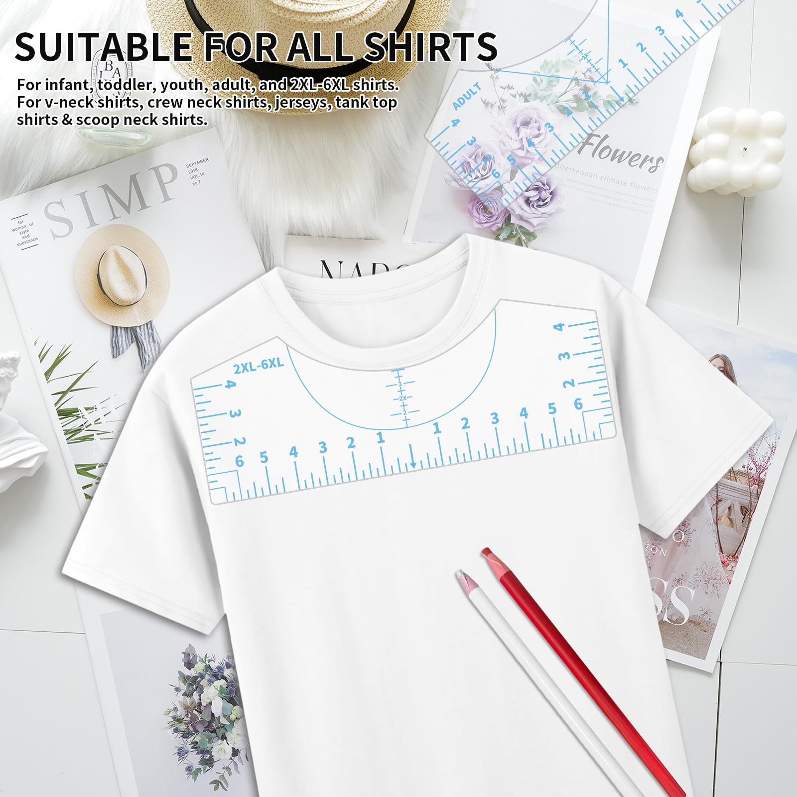 ✂️【Meet Different Needs】The rulers comes with 4 Styles, they are applied to all kinds size: Adult, Youth, Children and V-Neck. The rulers have advanced UV printed graduated numbers and marks that are clearly visible on the ruler guide, they are easy to read against almost any shirt color. Measurement has made easier by inch marks on both side of this shirt measurement tool for vinyl set.