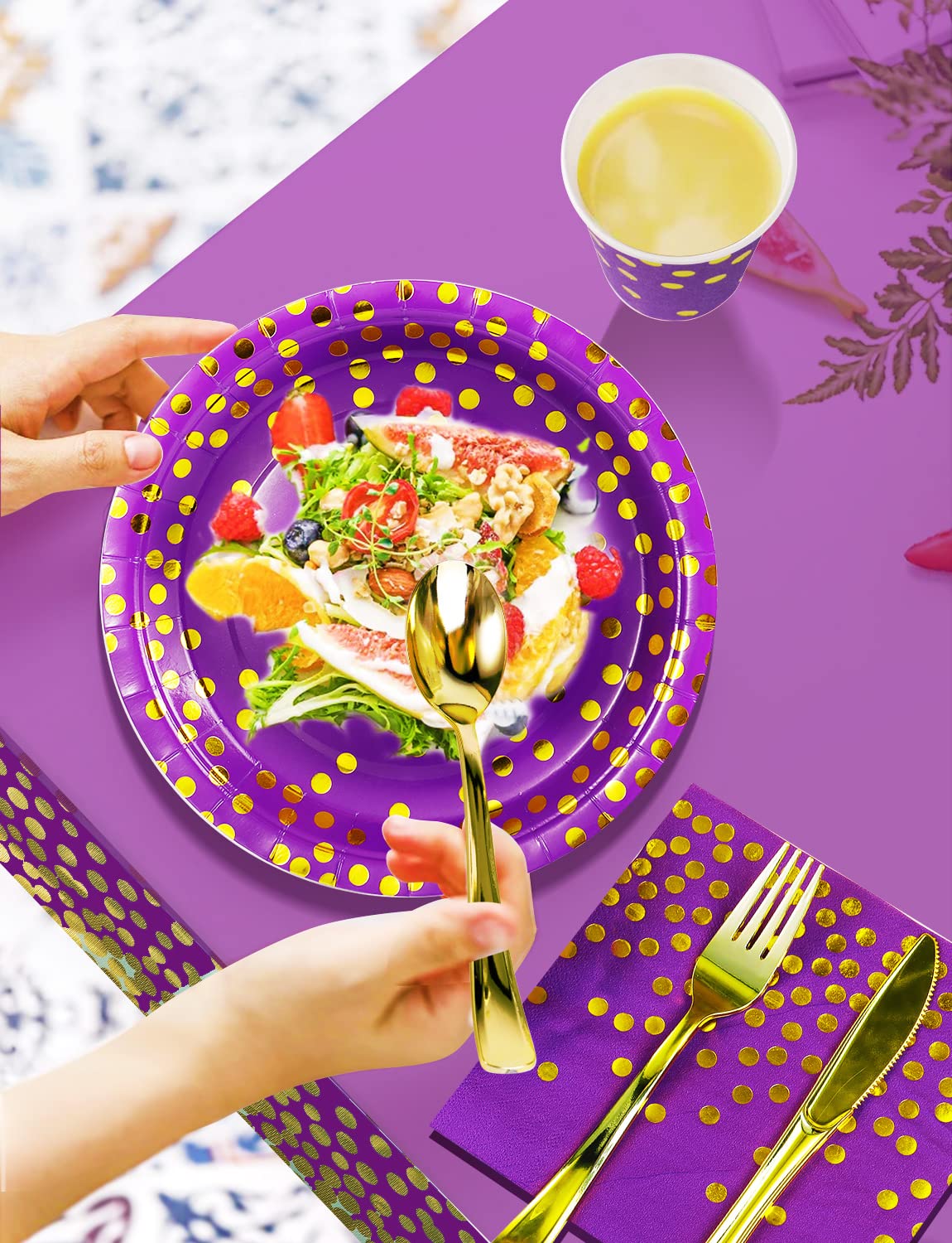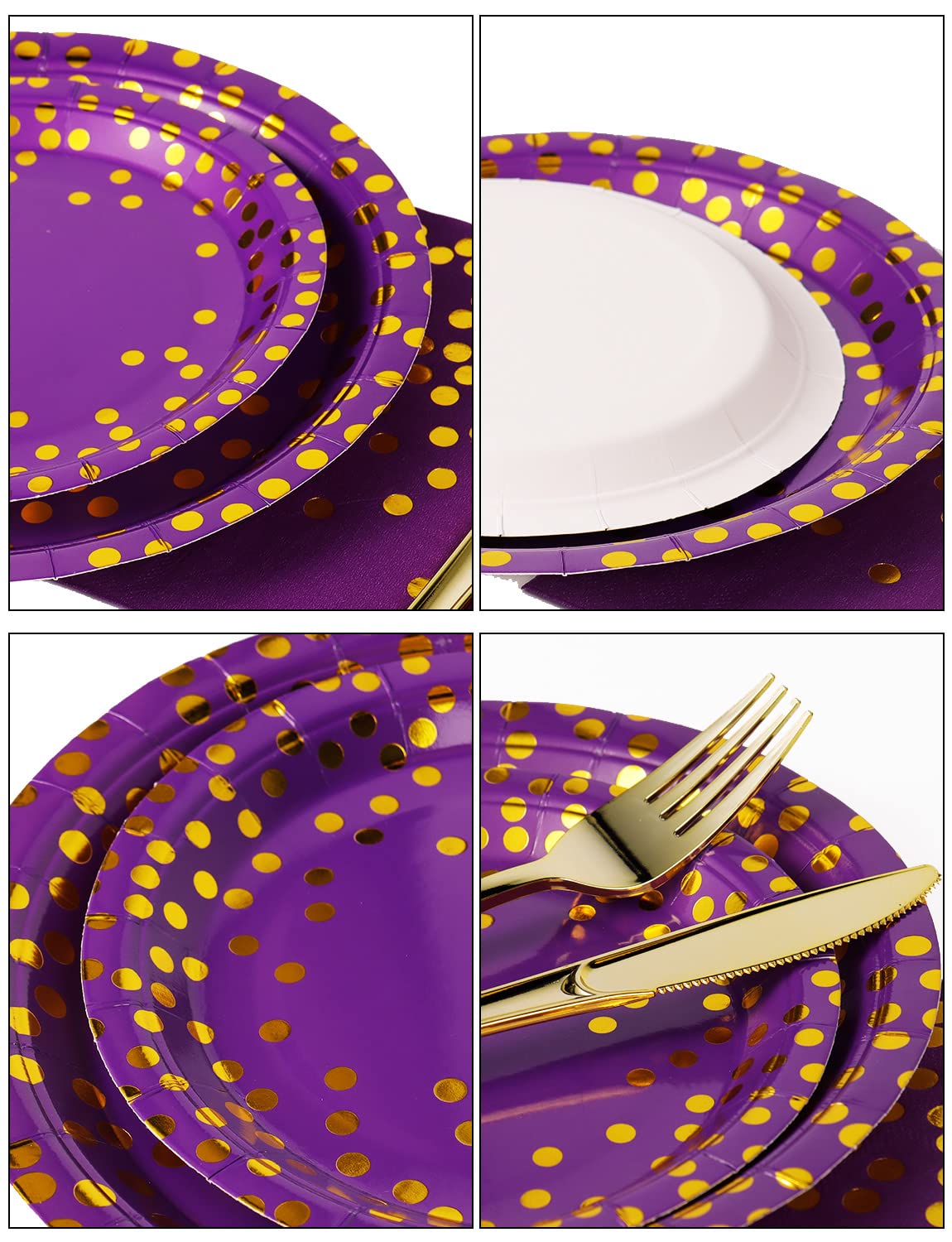 🍰【High Quality and Elegant Design】Our party supplies pack features a Purple background and gold foil polka dot pattern, adding a touch of sophistication to your event. Made of 100% food-grade paper, our plates are sturdy and can hold heavy foods without bending or breaking. All party dinnerware are made of BPA-free, non-toxic, and tasteless plastic that is very strong and won't bend or break.