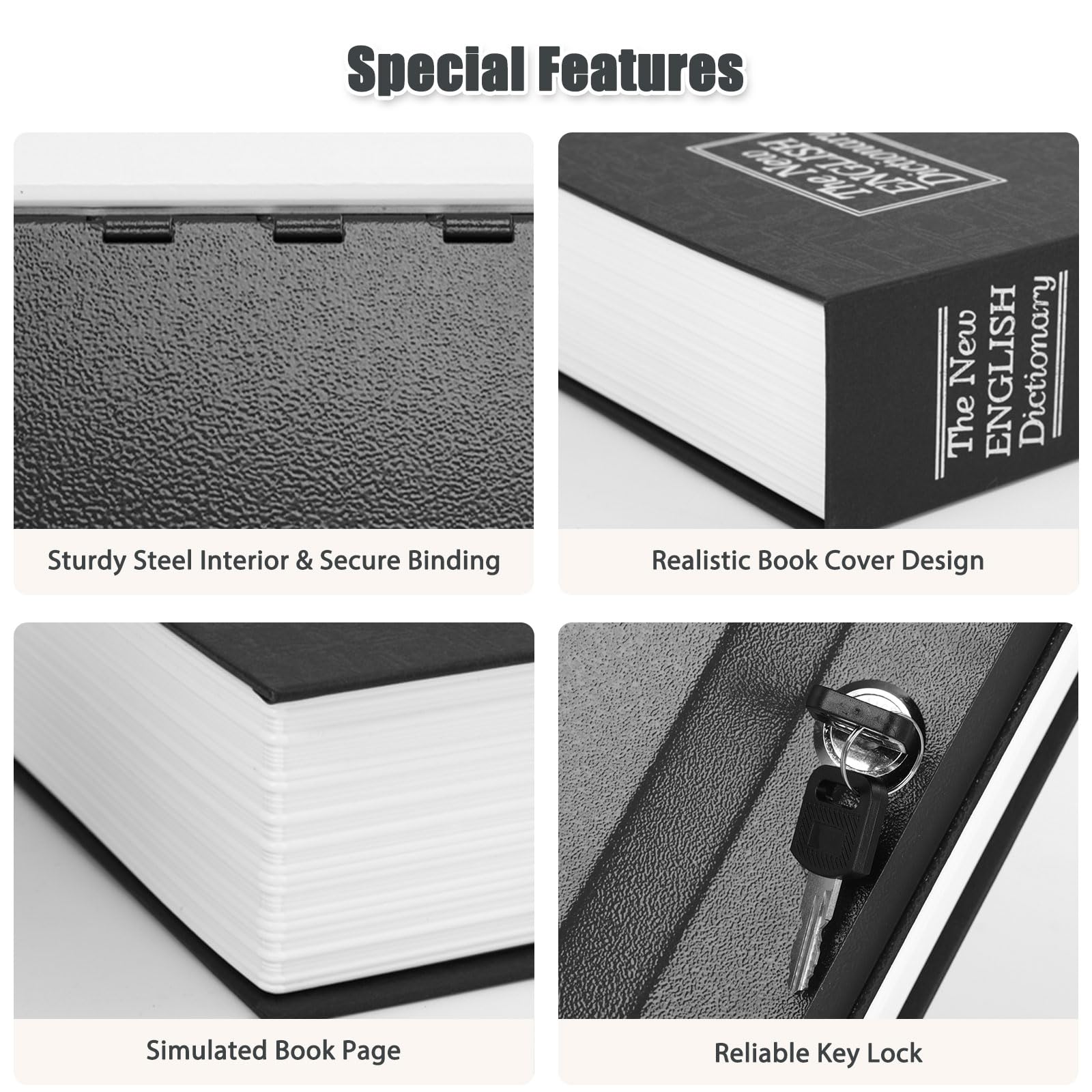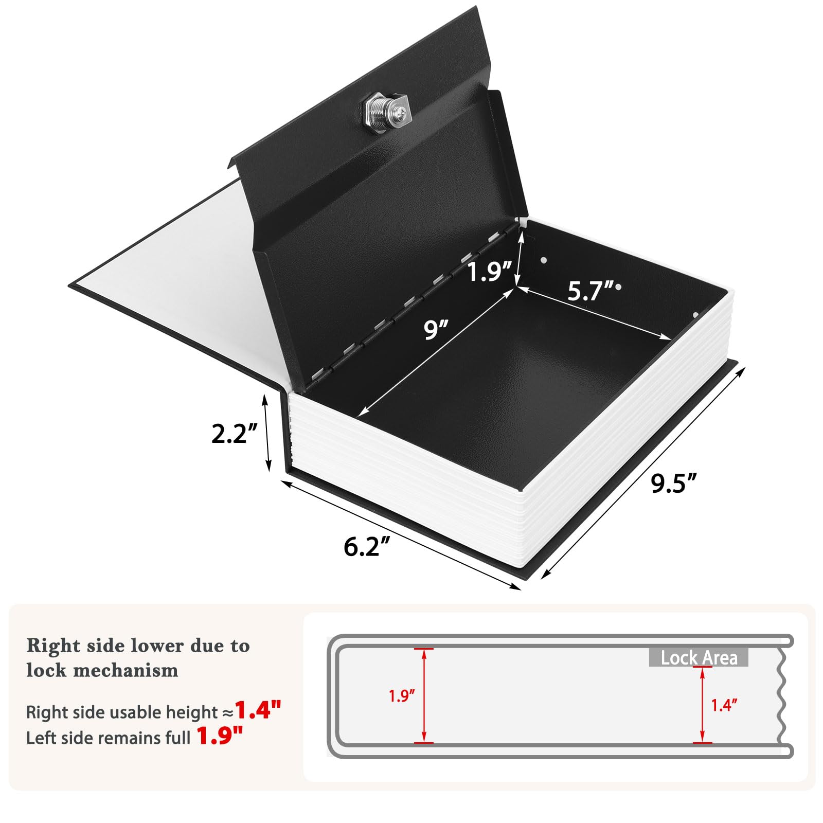 Size and Color: Book safe is 9.5" x 6.1" x 2 .2" Black Large.