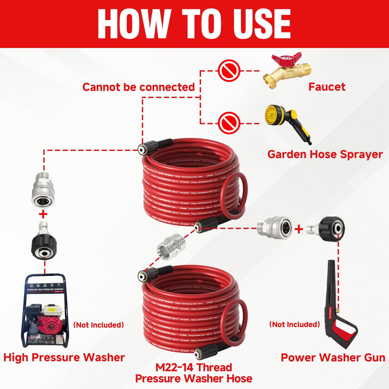 Universal Compatibility: Our high-pressure hose is equipped with a stainless steel M22-14mm thread, ensuring seamless compatibility with a variety of pressure washer accessories. It serves as an ideal replacement or extension for most brands such as Ryobi, Troy Bilt, Greenworks, Simpson, and more
