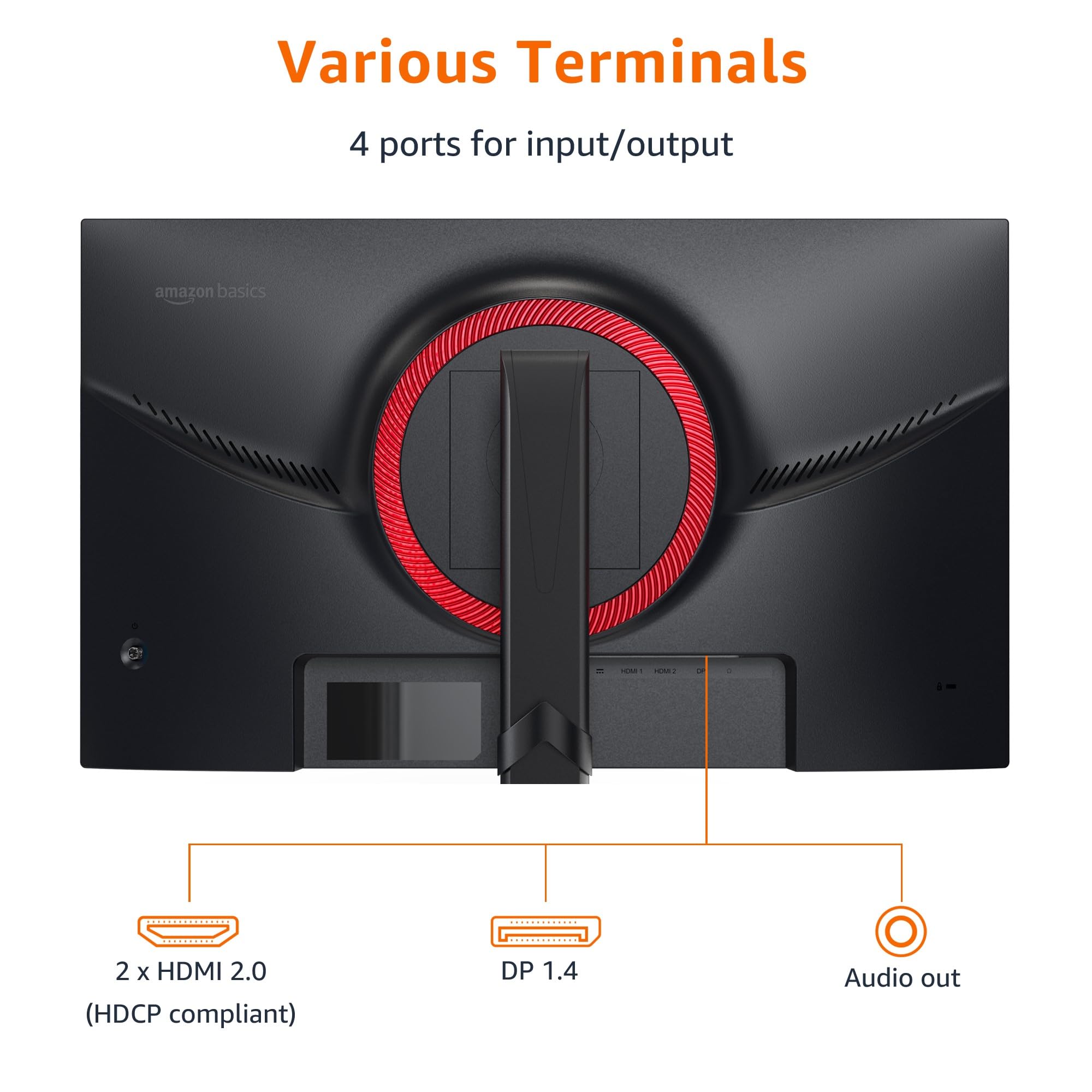 Additional specs include adaptive sync, VESA compatibility, and 165Hz (Note: To achieve maximum refresh rate, ensure your computer ports and graphics card support FHD output at 165Hz. Use a DisplayPort 1.4 or HDMI 2.0 compatible cable. Consult your device manufacturer's manual for more information. Finally, select the maximum 165Hz refresh rate in your computer's advanced display settings.)