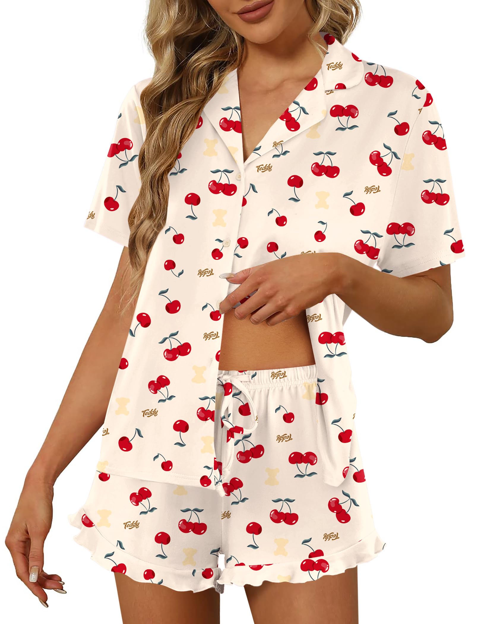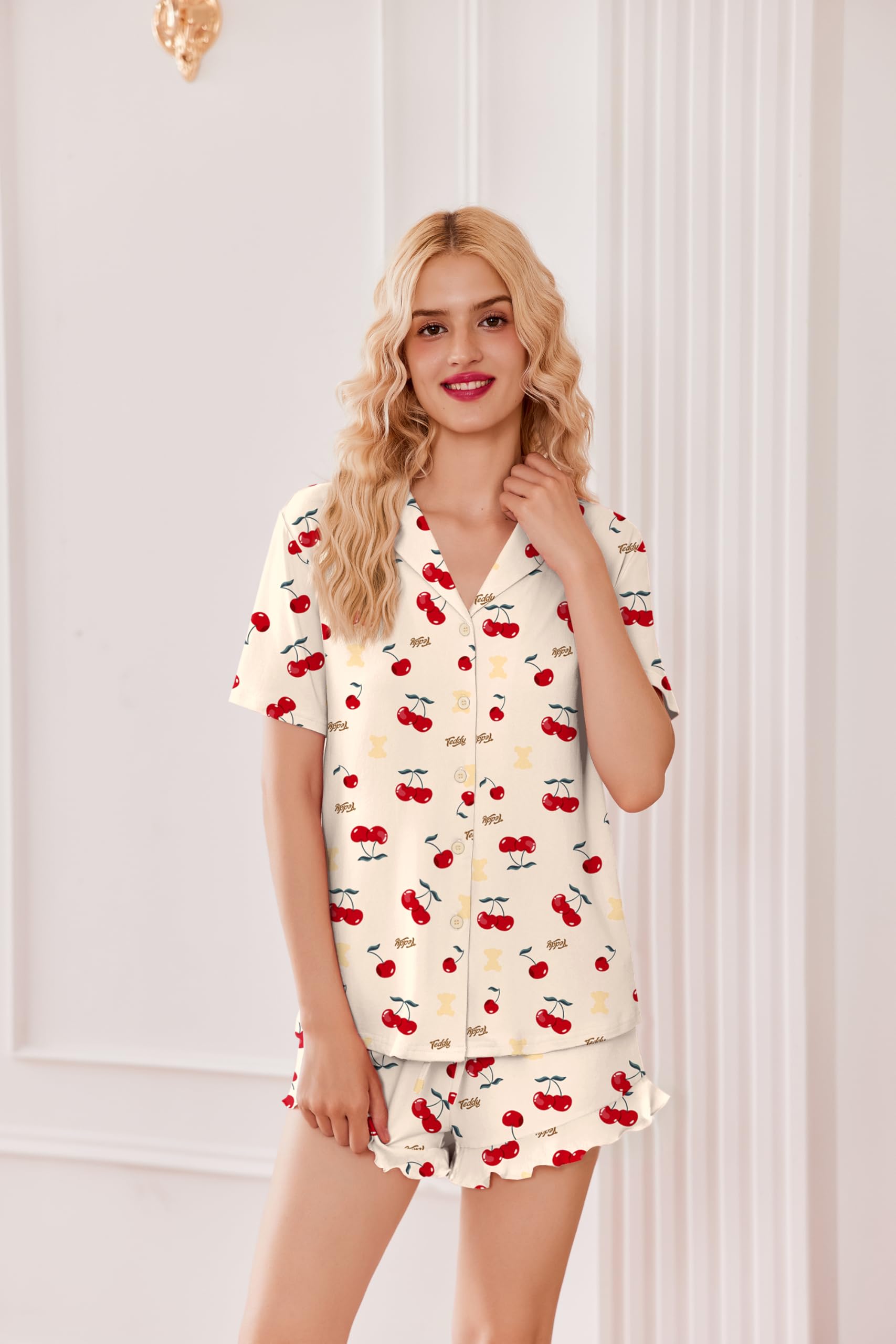 【Pajama Top】:Women's short sleeve pajamas set with solid color, sleepshirt hits at hip , turn-down collar, Full Button Design is easy to put on and take off