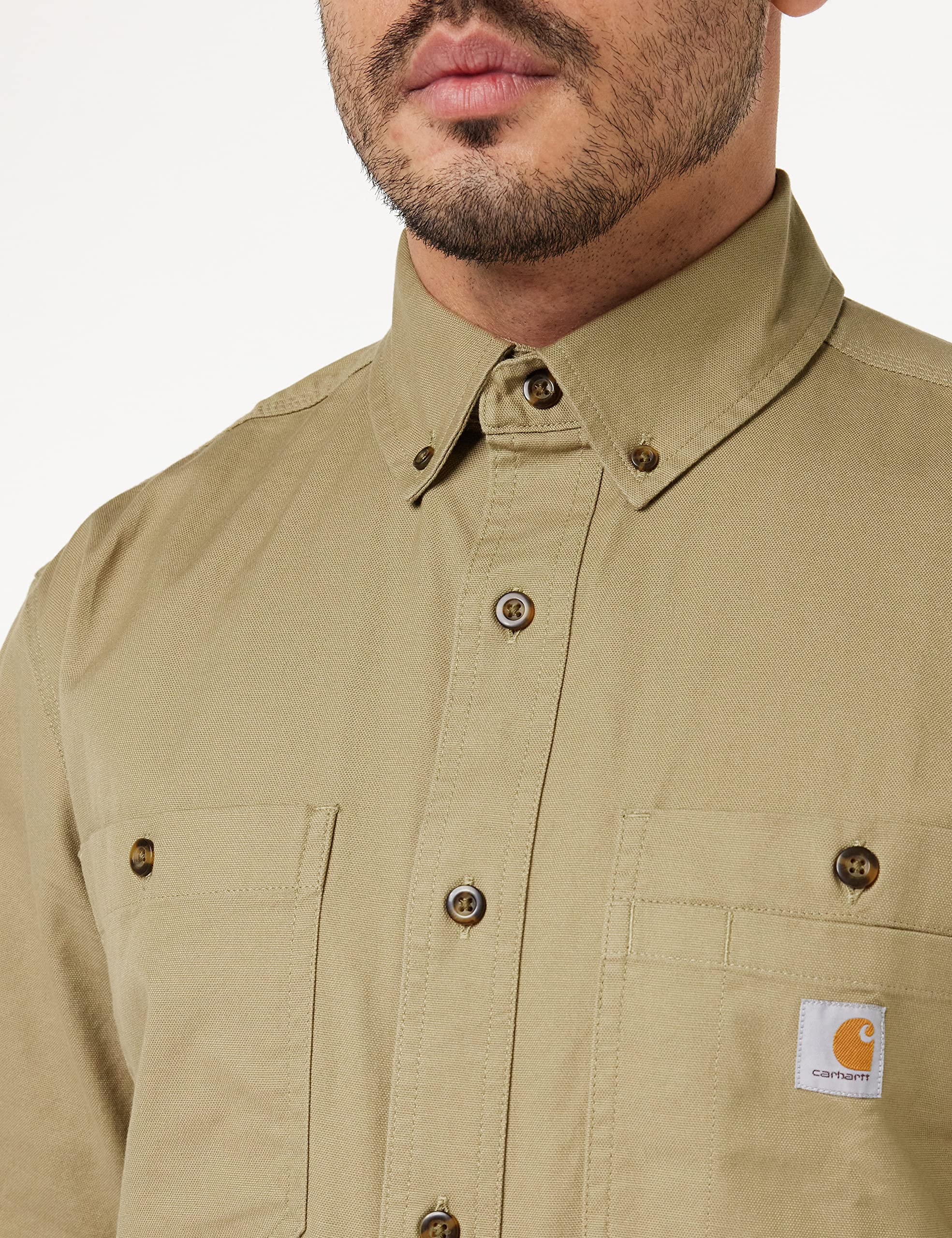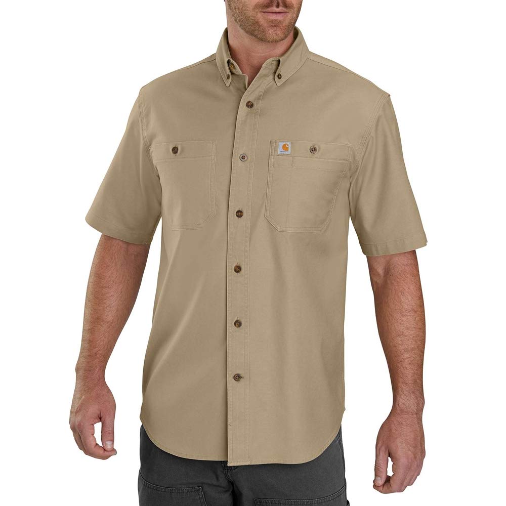 Description This durable short-sleeve work shirt comes standard with built-in stretch, so whatever you're doing, it's easier to do. Relaxed fit 6.5-Ounce, 98% cotton/2% Spandex rugged flex technology for ease of movement two chest pockets with additional left-chest pocket panel for added storage button-down collar two-button adjustable cuffs with extended plackets faux horn buttons drop-tail hem for additional coverage Carhartt-strong triple-stitched main seams imported