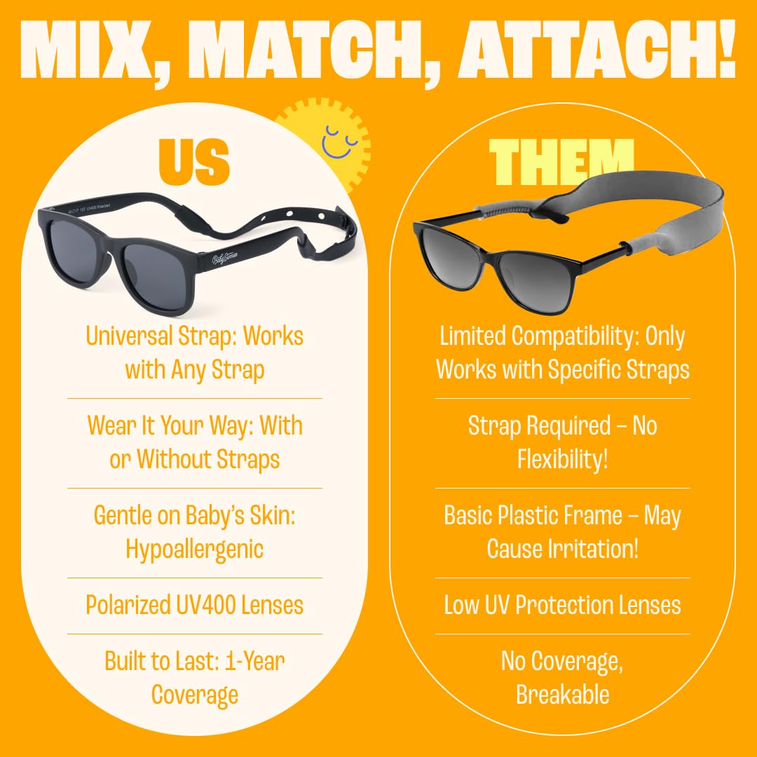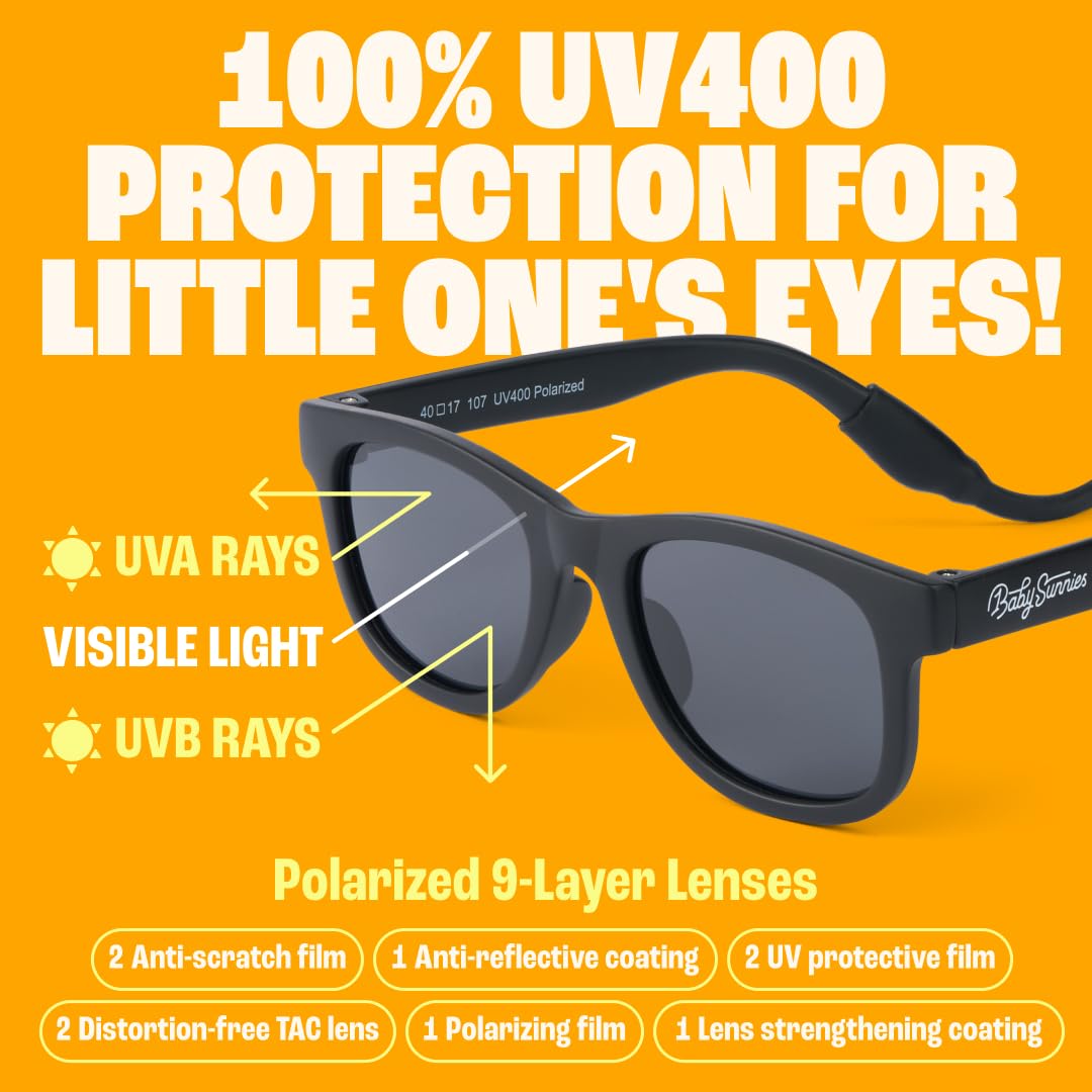Ultimate UV Protection: Protect your baby’s eyes like never before. Our premium 9-layer polarized lenses offer full UV400 protection, blocking 100% of UVA and UVB rays. These high-performance lenses reduce harsh glare and eye strain, perfect for sunny days, stroller walks, beach trips, car rides, and other newborn or toddler travel adventures.