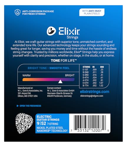 CONTENTS: 1x Elixir Strings, Electric Guitar Strings, Nickel Plated Steel with NANOWEB Technology, Longest-Lasting Bright Tone with Comfortable Feel, 7 String Super Light 9-11-16-24-32-42-52