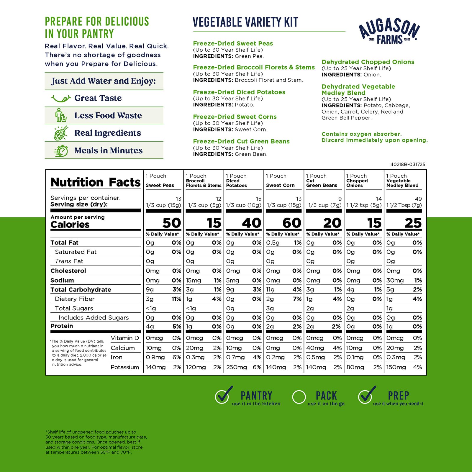 QUICK PREPARED FOODS - Augason Farms Vegetable Variety Kit includes diced potatoes, broccoli florets with stems, sweet peas, green beans, chopped onions, sweet corn, and a vegetable medley blend with potato, cabbage, onion, carrot, celery & bell pepper