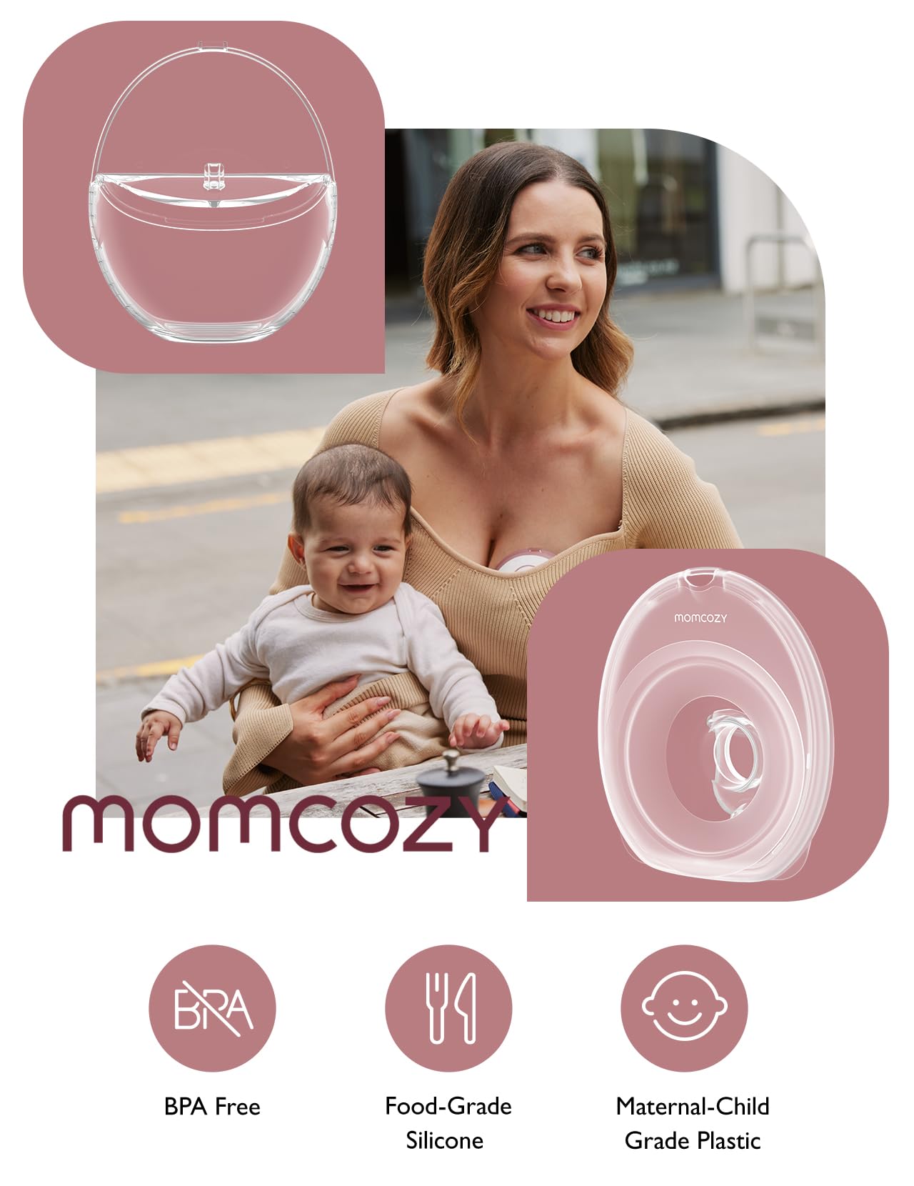 BPA-free, made of food-grade silicone material. All Momcozy pump parts that come in contact with breast milk are BPA-free, giving you peace of mind about your baby's milk.