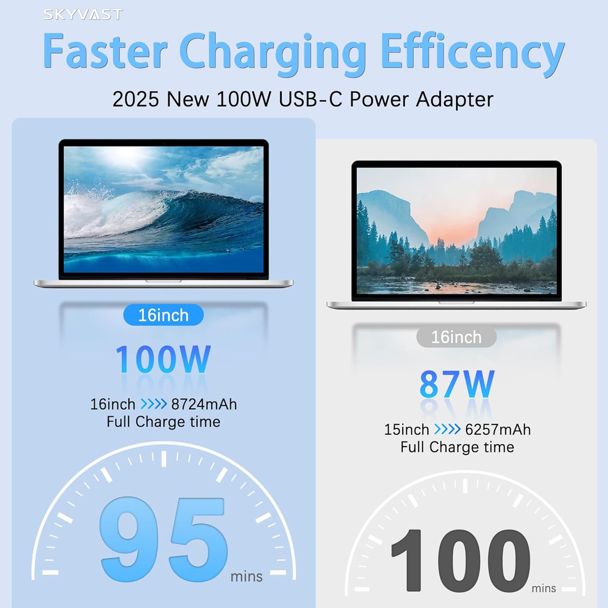 Efficient Charging:100W USB C Mac Book charger charges up to 96% efficiently, fully charging most laptops in 1 hour and 30 minutes and cell phones from 0% to 80% in just 20 minutes. A replacement for Mac Book Pro charger, our USB C charger is compatible with various devices and features a long 2-meter USB-C to C cable for convenience while working or lying down. Higher charging performance than 96W/87W/67W/61W/30W/29W USB C Charger