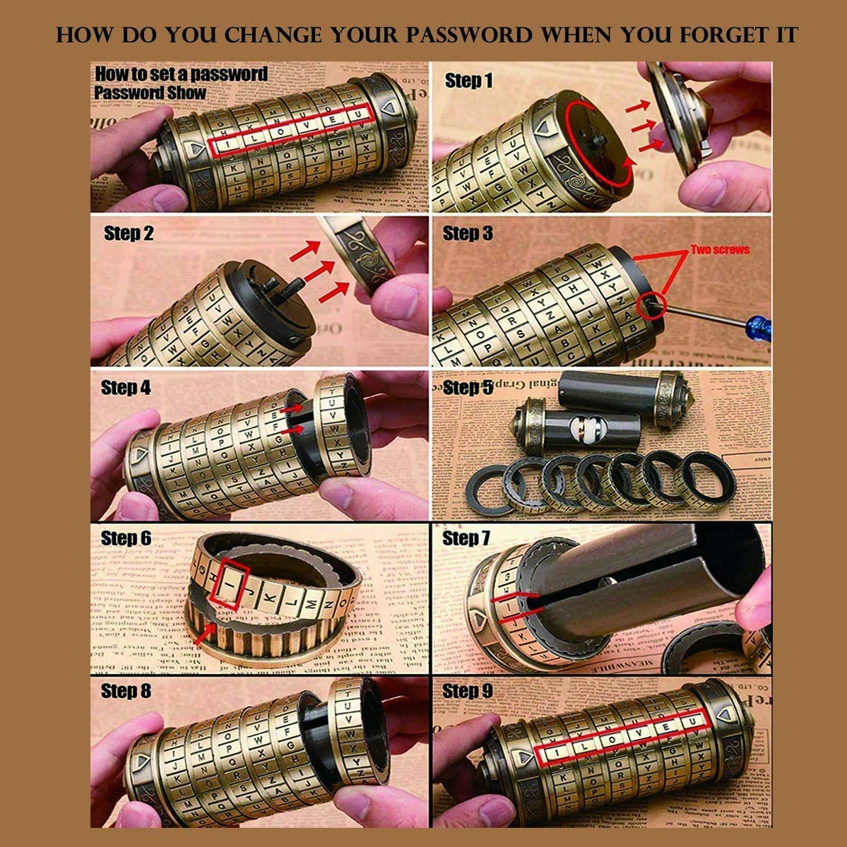 【EASY TO USE】Password setting: The default password of the cryptex is I LOVE U, you can also set your own password. We provide steps and tools to modify the password, which is very simple. You can play a detective game with your partner or children and provide different clues for the other party to analyze the password and get clues. This kind of puzzle game not only trains thinking ability, but also promotes your feelings.