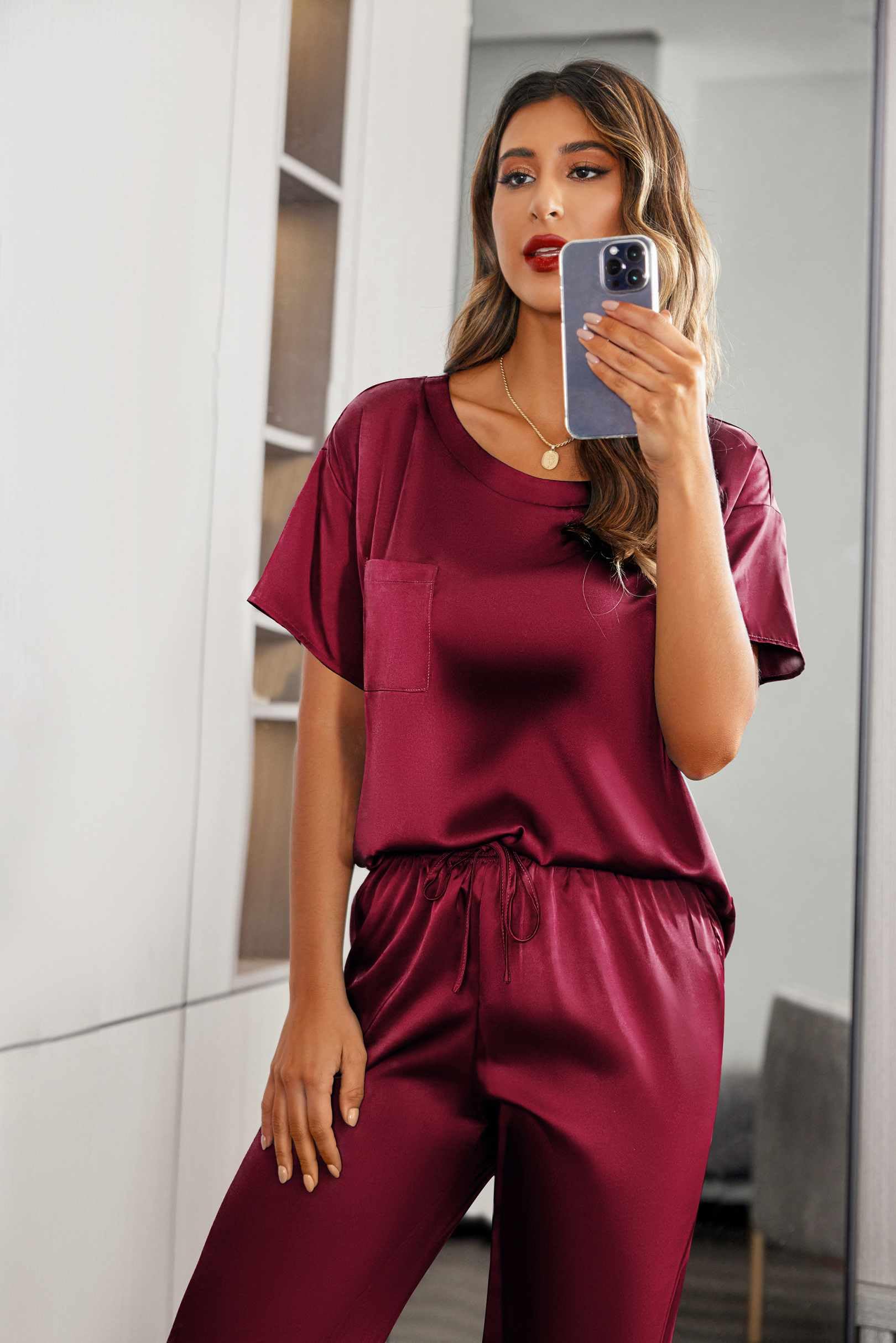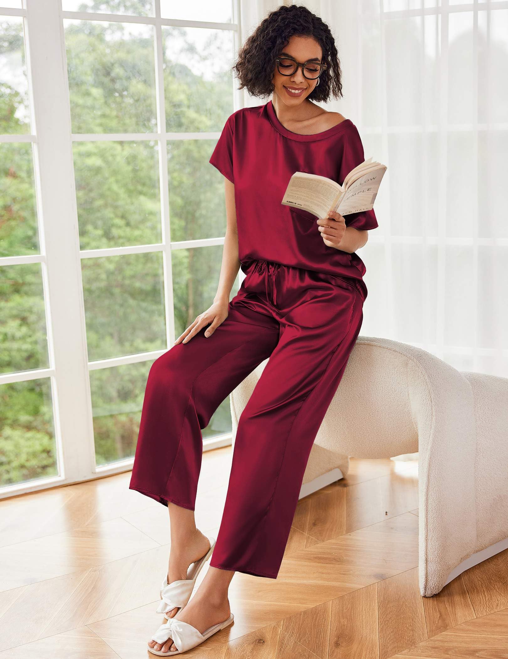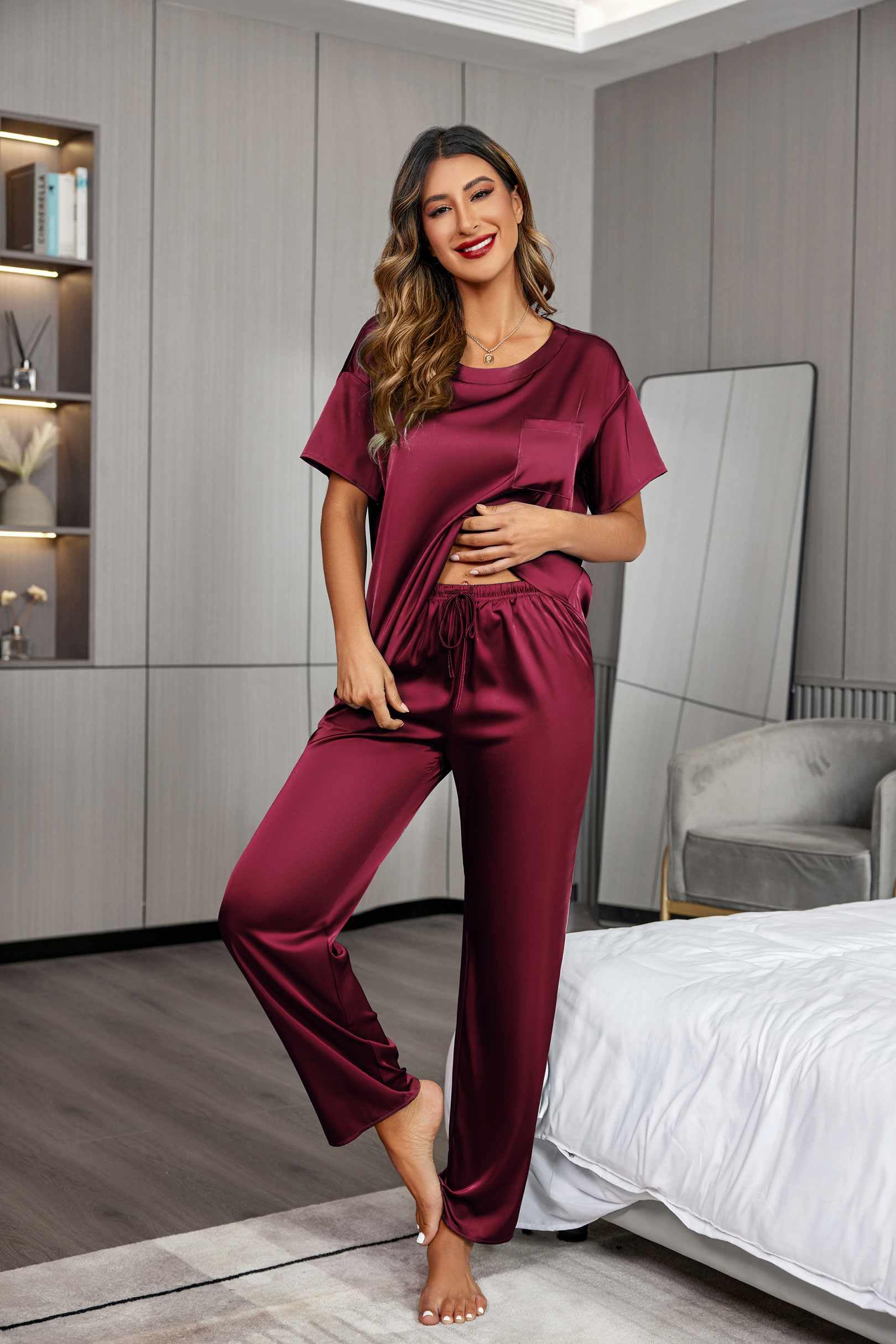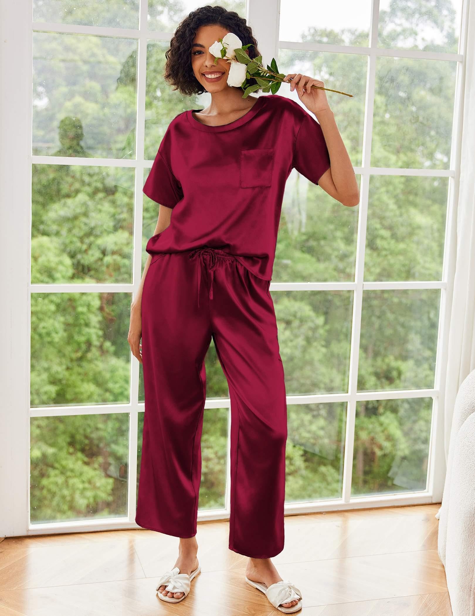 A lightweight two-piece pajama set featuring a pullover tee top and long pants. Soft satin silky fabric, comfy to wear.