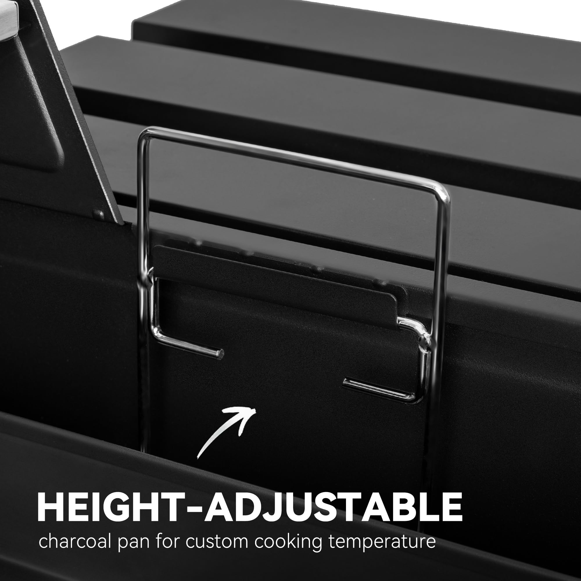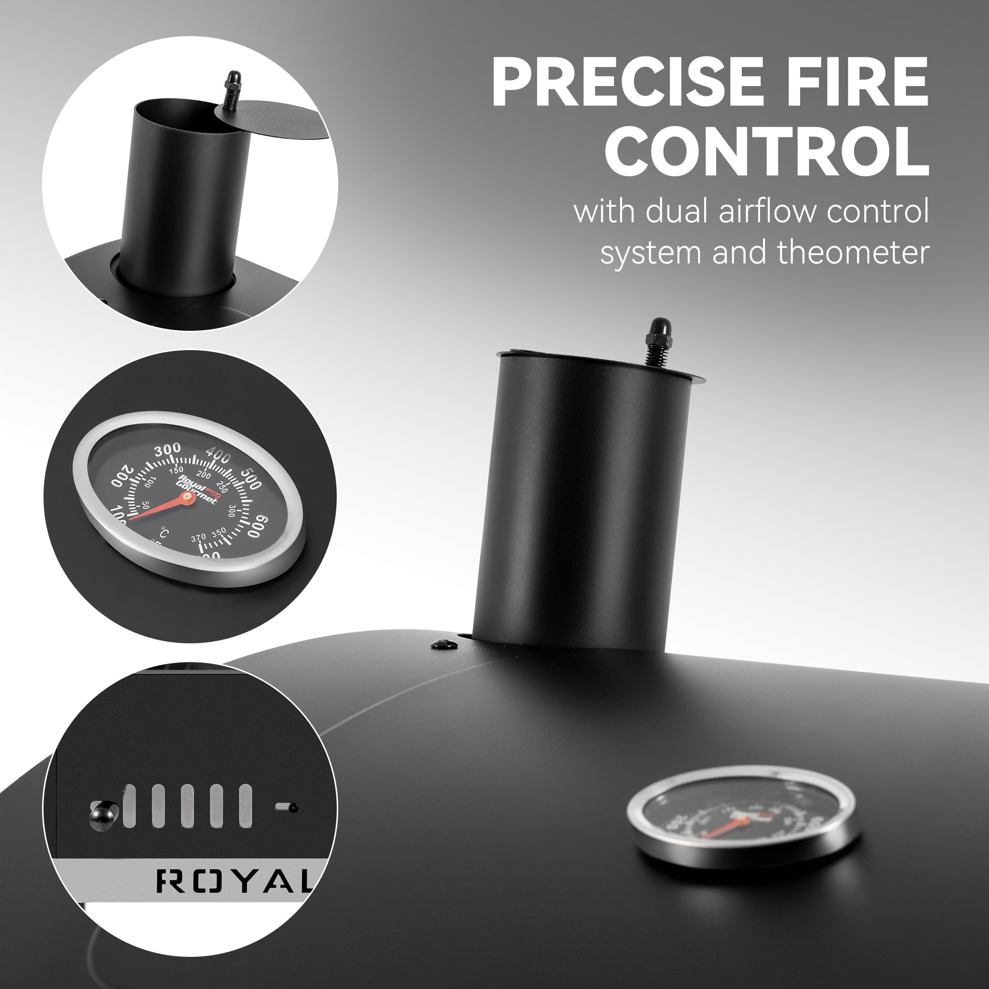 Professional Temperature Control: A lid-mounted stainless steel thermometer monitors temperature precisely in real-time, while 2-level height-adjustable charcoal pan, two adjustable air vents and a stack allow for exceptional temperature control